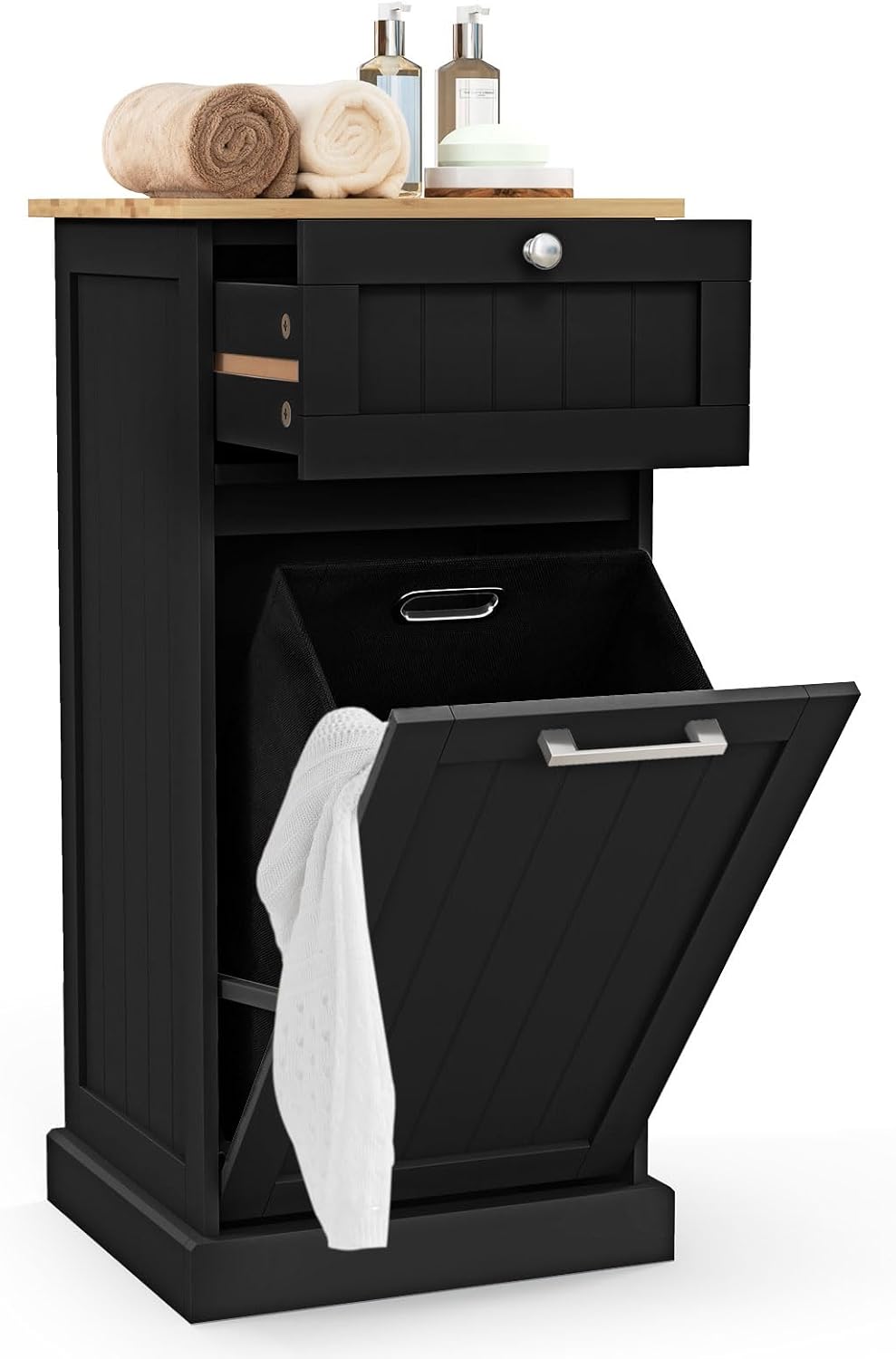 ----【Rangement cachée】Derrière la porte basculante, un panier à linge en tissu (inclus) jusqu'à 38L ou une poubelle(non inclus) peut être placé.