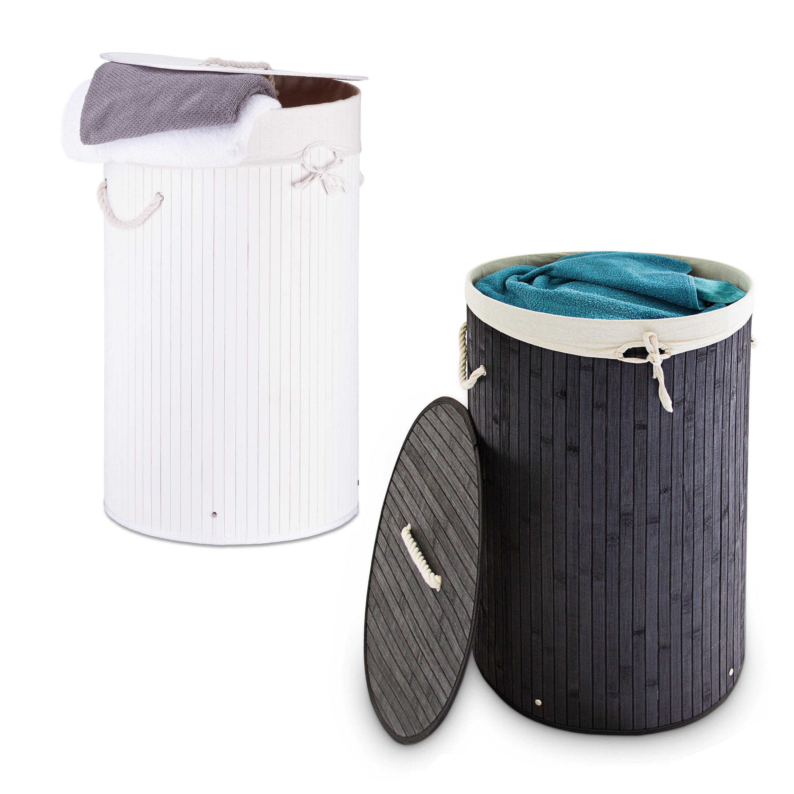 Panier à linge bambou, lot de 2, corbeille linge pliante, 80 L, sac intérieur coton, noir - blanc