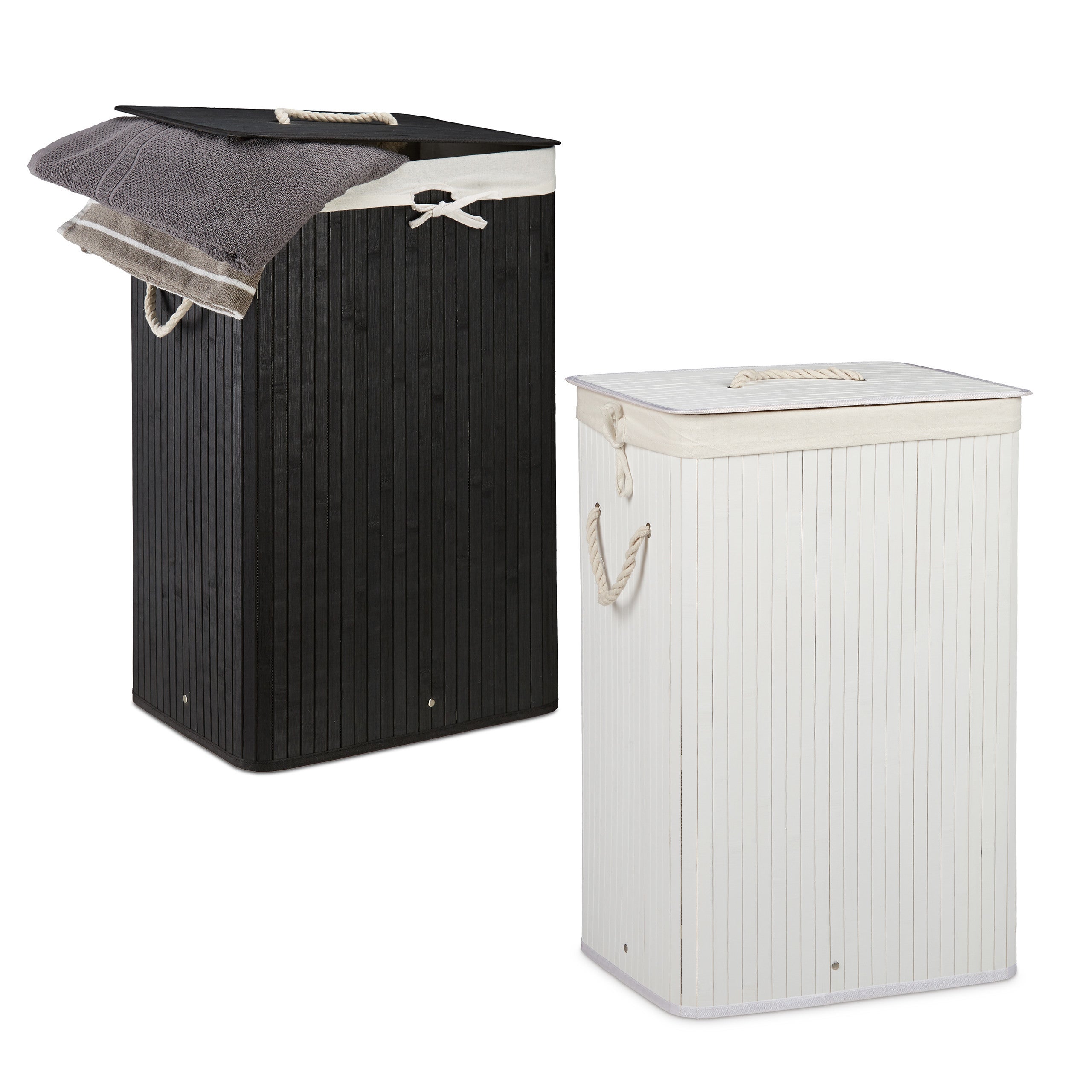 Panier à linge bambou, lot de 2, corbeille linge pliante, 83L par panier, sac intérieur coton, noir et blanc