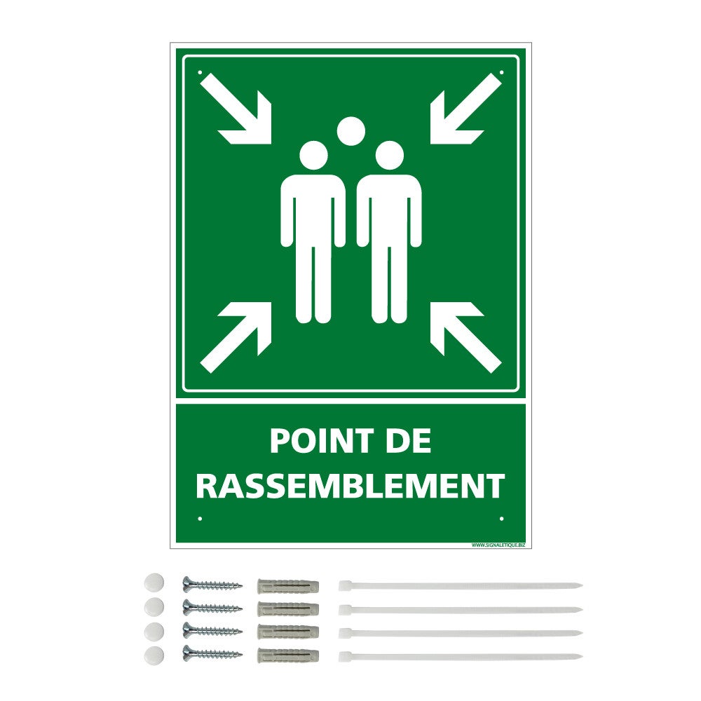 Panneau de signalisation prépercé point de rassemblement aluminium rectangulaire + kit de fixation - 300 x 420 mm