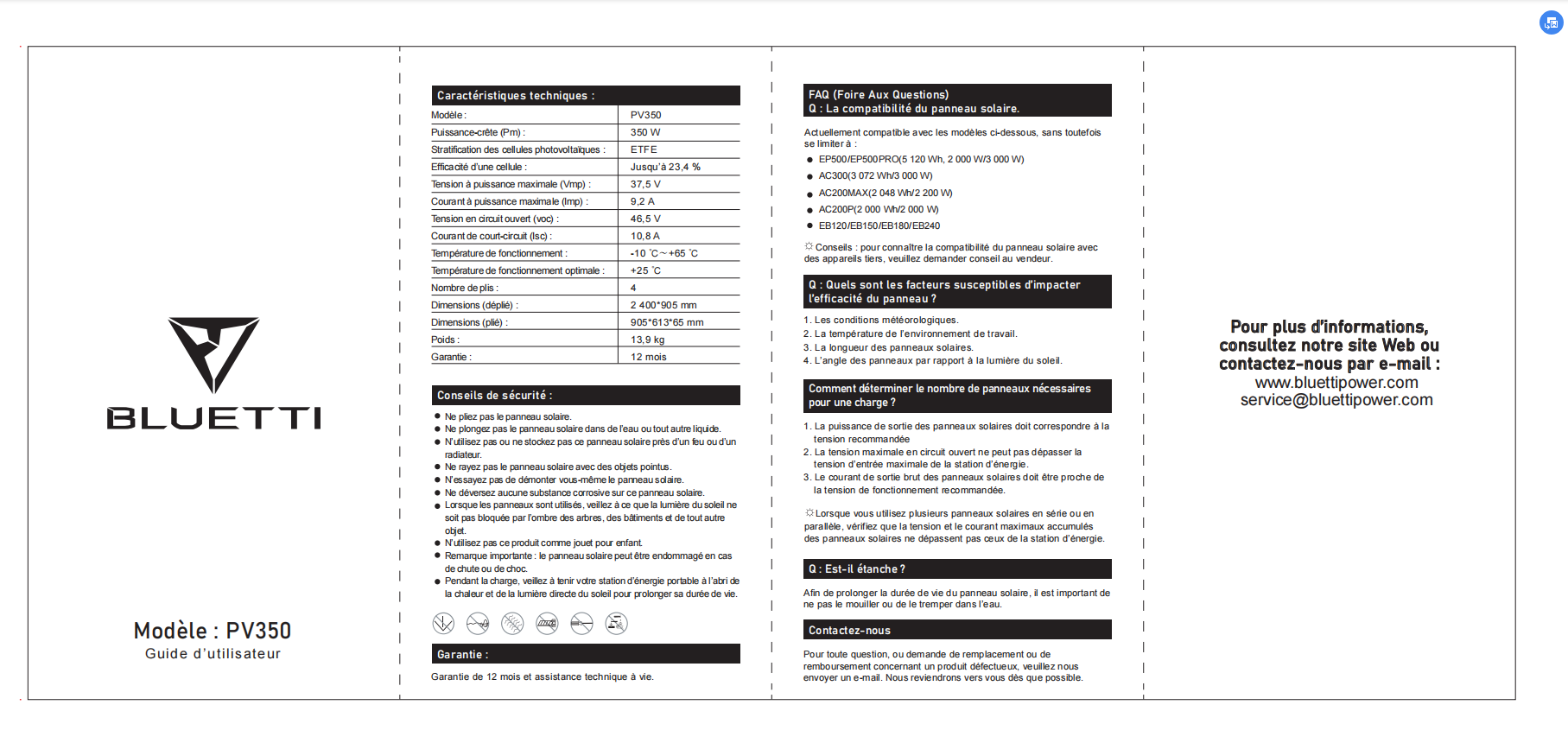 - [Ce que Vous Recevez] - Panneau solaire BLUETTI PV350, manuel d'utilisation, garantie de 12 mois.