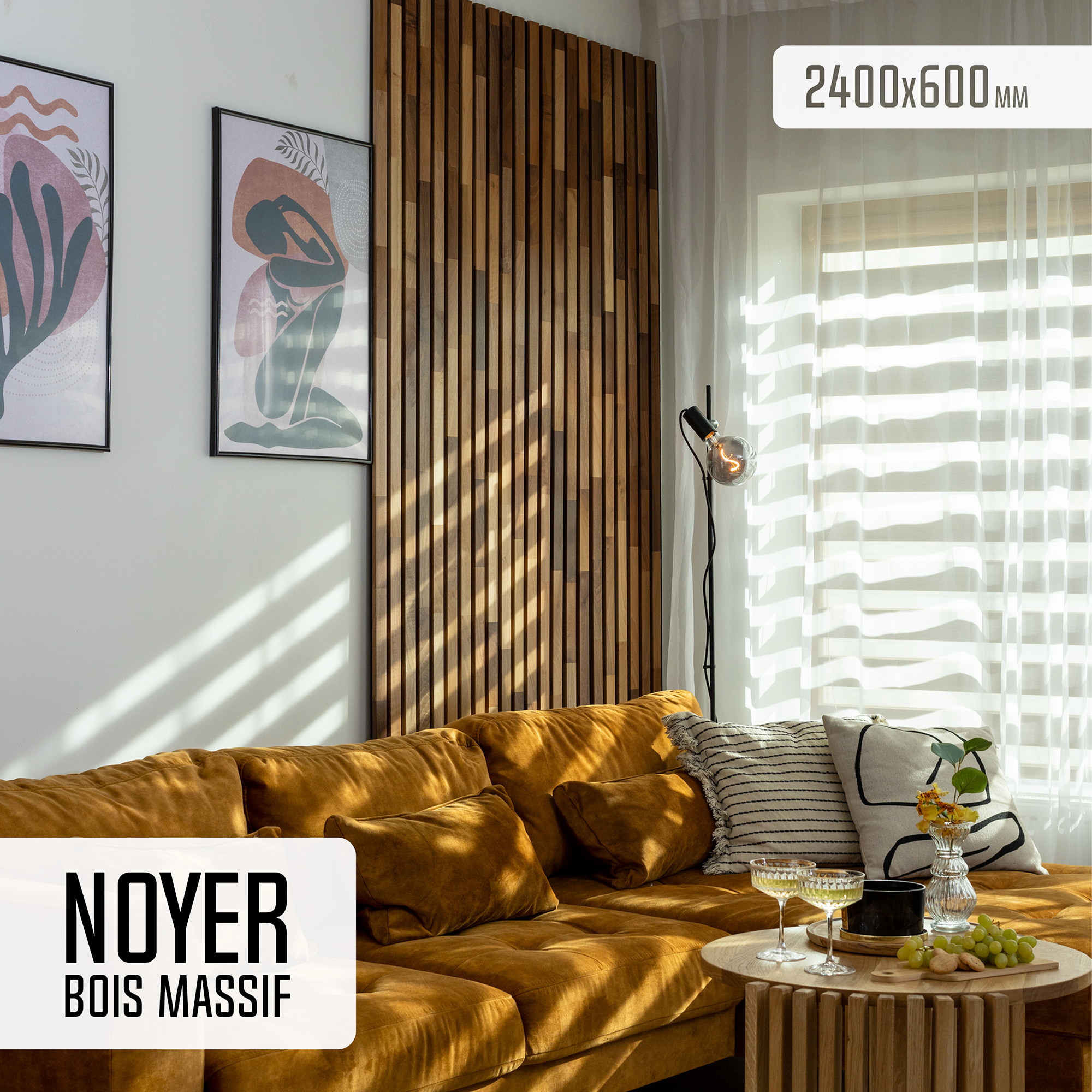 Panneau Tasseau Acoustique en Bois - Noyer Massif - 2400x600mm - Lattes 40mm, Support en Feutre Noir