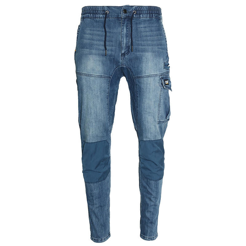 Jeans de travail baggy coupe slim très moderne. Tissu denim composé de 65% coton, 34% polyester, 1% spandex, 340g/m². Renforts sur les genoux en polyester Oxford 195g/m². Taille élastique avec cordon de serrage et bouton. Gousset d'entrejambe en diamant pour augmenter son confort. Deux poches latérales à l’italienne. Deux poches arrière plaquées. Ouverture des poches arrière renforcées par le tissu Oxford. Une poche cargo avec fermeture sécurisée et un logo CAT dessus. Coupe slim avec une ouverture pour les jambes de 33 centimètres.