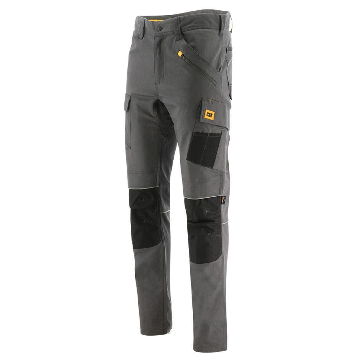 Pantalon de travail avec ouverture pour les jambes de 38 cm. 65% coton, 33% polyester, 2% toile élasthanne, 250g/m². Renfort 1 : 100% nylon oxford CORDURA. Renfort 2 : 100% nylon oxford.Coupe étroite avec gousset d'entrejambe en diamant. Renfort de genou en CORDURA. Les boucles de ceinture s'adaptent à une ceinture de 57 mm. Logo CAT sur le passant arrière de ceinture. Poche cargo latérale avec fermeture sécurisée et poches empilées. Les poches arrière sont coupées du vêtement pour plus de confort. Boucle de charpentier sur la hanche droite. Poche pour téléphone sur la cuisse droite avec fermeture à crochet. Tissu deperlant. Poches pour genouillères CW91 particulièrement confortables. Braguette à fermeture à glissière. Logo CAT en silicone sur la cuisse gauche.