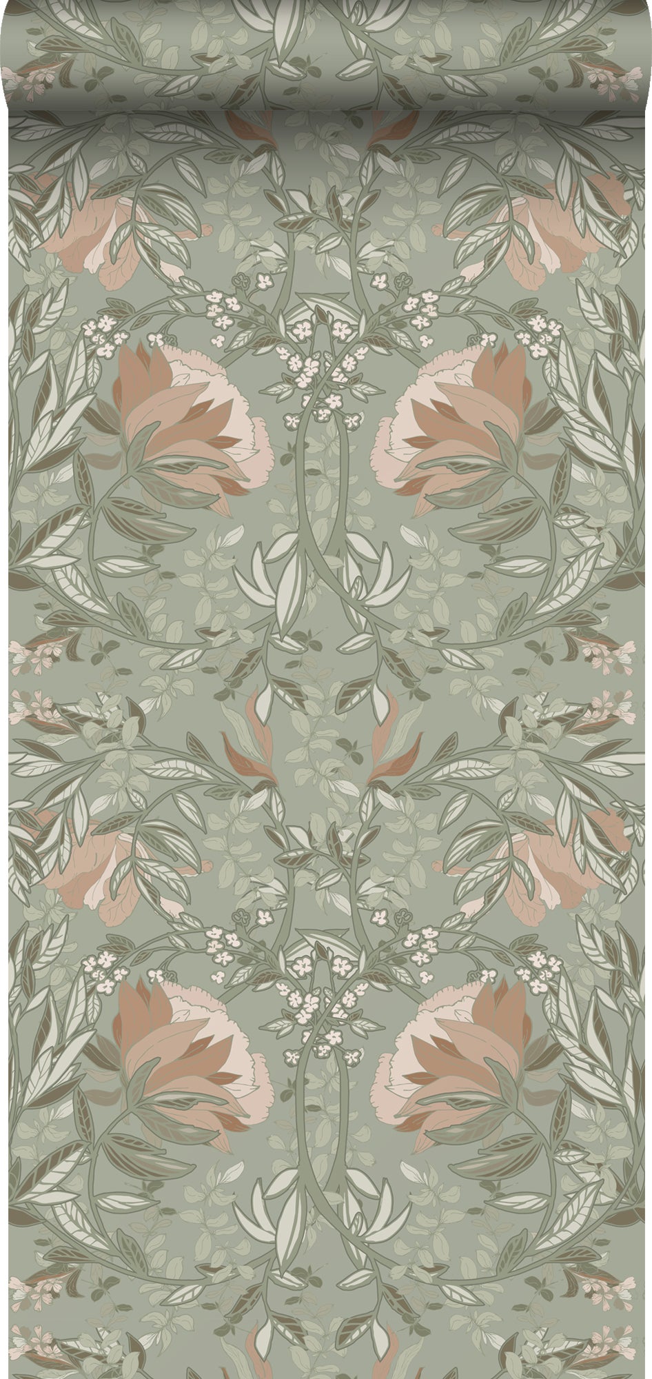 Papier peint fleurs vintage de style art nouveau vert grisé et vieux rose - 53 cm x 10.05 m - ESTAhome