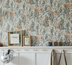 Décorez vos murs avec ce papier peint au motif d'un treillis végétal de coloris clairs sur un fond bleu pastel.