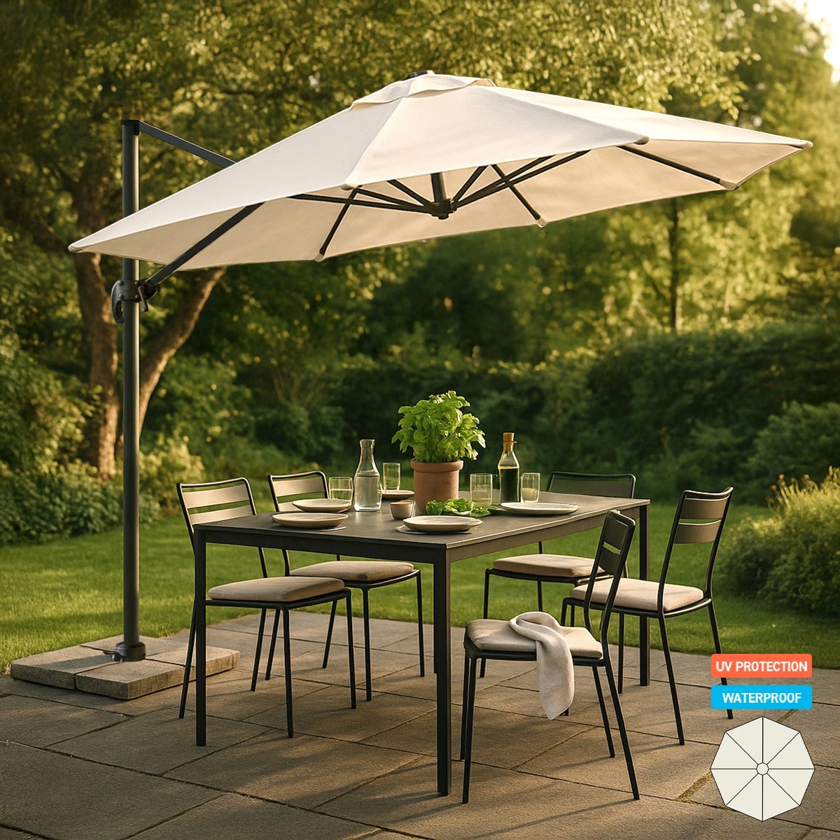 Parasol de Jardin déporté 3x3, structure en aluminium, élégant et fonctionnel, est parfait pour décorer les espaces extérieurs des cafés, des restaurants et des hôtels, produit de très haute qualité, exclusif et résistant.
