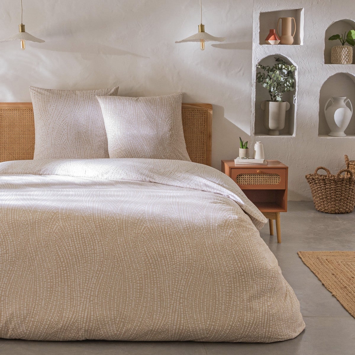 Parure de lit 2 personnes en coton 57 fils imprimé beige 260x240cm