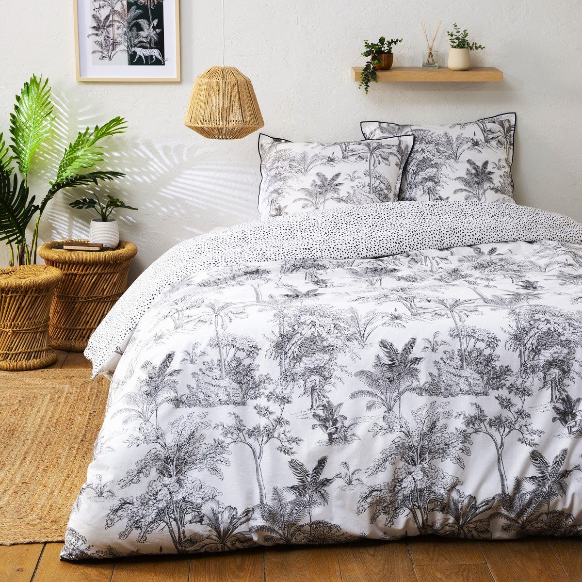 Parure de lit en coton réversible imprimé jungle 57 fils blanc comprenant 1 housse de couette + 2 taies d'oreiller 63x63cm.