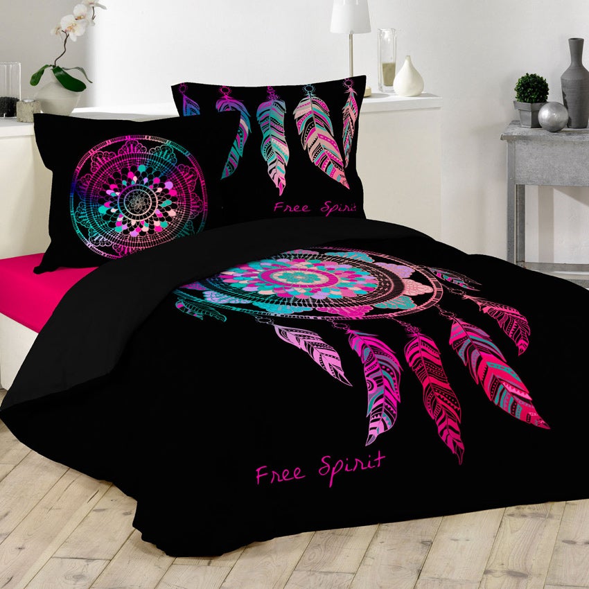 La housse de couette en coloris noir, est imprimée d'un gros attrape rêves en coloris fluo de fuchsia et turquoise.