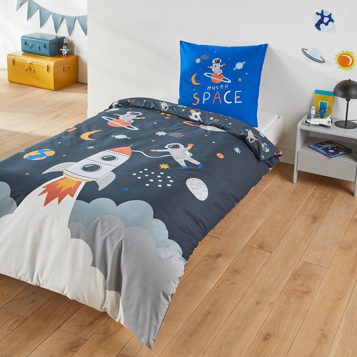 • Housse de couette : recto imprimé grand motif fusées et planètes, verso imprimé petit motif fusées et planètes