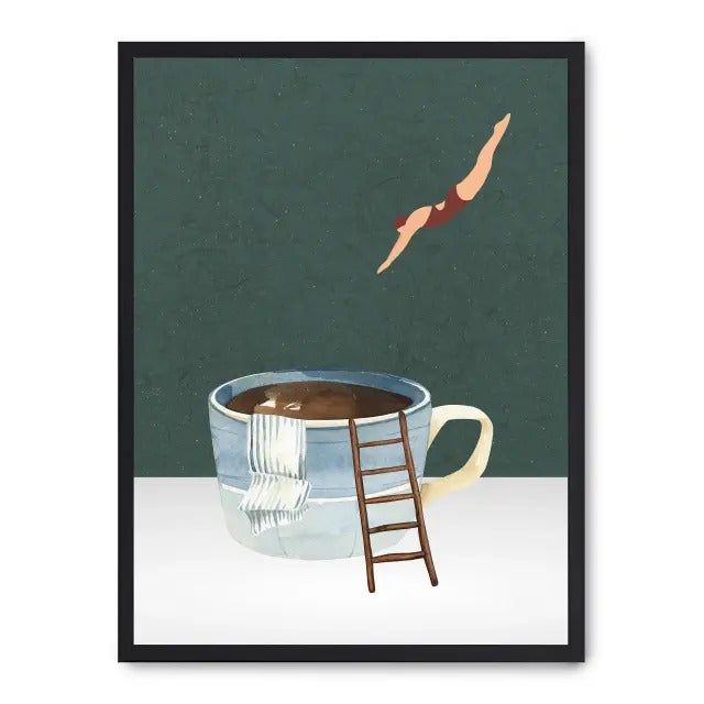 passer à la peinture au café Matériel : Affiche imprimée sur papier premium 180gr, montée sur un cadre en bois MDF finition noire. Couleur: multicolore Cette illustration représente la joie d'un bon café du matin. La femme sautant dans la tasse représente notre immersion dans la journée, pleine d'énergie et d'enthousiasme. Quelle meilleure façon de commencer la journée qu'avec une tasse de café ? . Une touche d'humour pour une image qui nous rappelle qu'il y a des petites choses qui peuvent égayer notre journée. Un bon plongeon pour commencer la journée ! Affiche imprimée sur papier premium 180gr, montée sur un cadre en bois MDF finition noire. 30x40cm