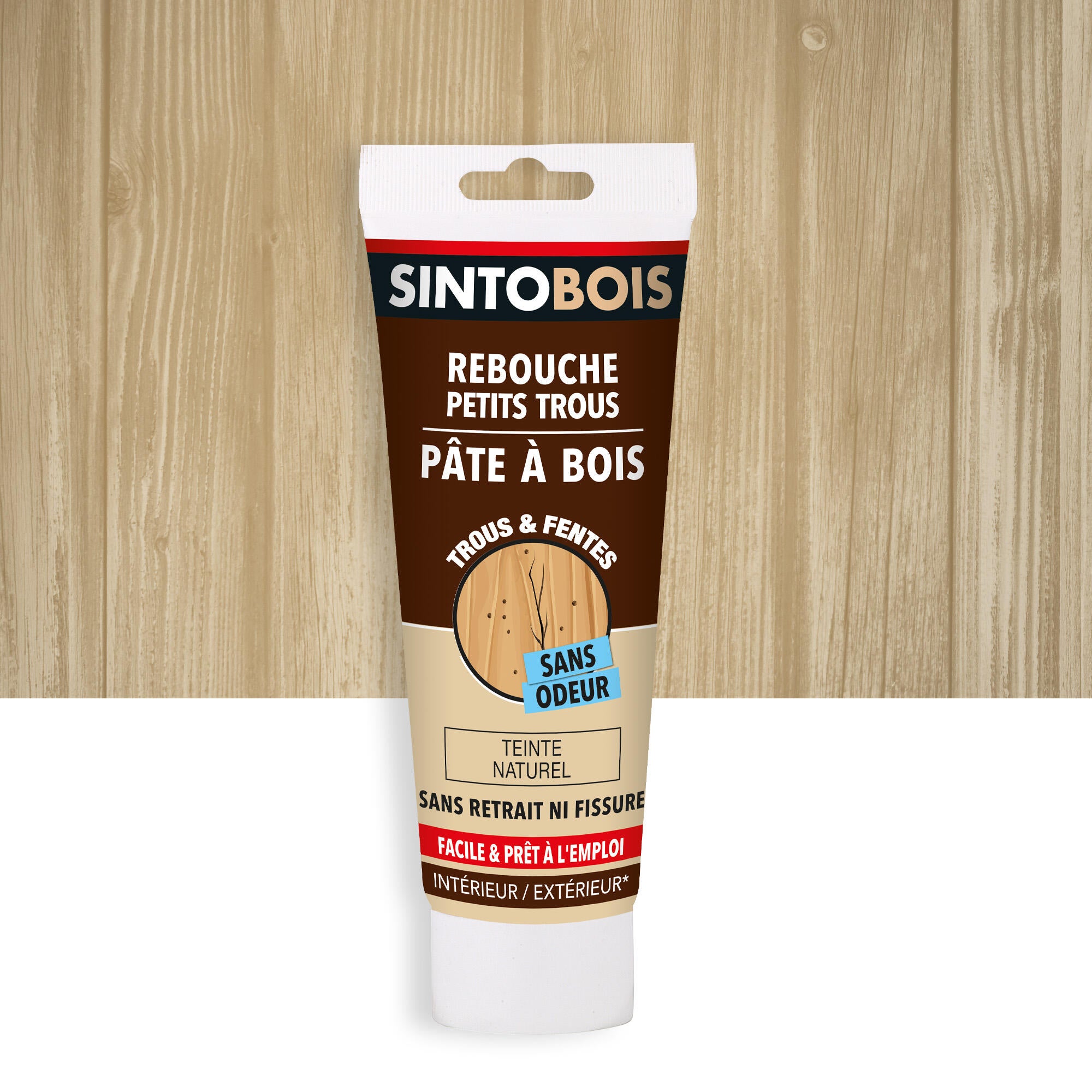 La pâte à bois "Rebouche imperfections" Sintobois répare les fissures et trous de vers ou de clous sur les mobiliers en bois, les portes, les fenêtres, les escaliers... que ce soit à l'intérieur ou à l'extérieur.