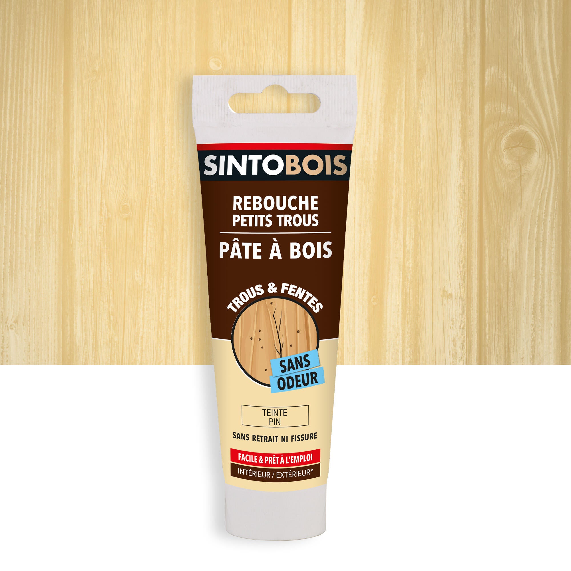 La pâte à bois "Rebouche imperfections" Sintobois répare les fissures et trous de vers ou de clous sur les mobiliers en bois, les portes, les fenêtres, les escaliers... que ce soit à l'intérieur ou à l'extérieur.