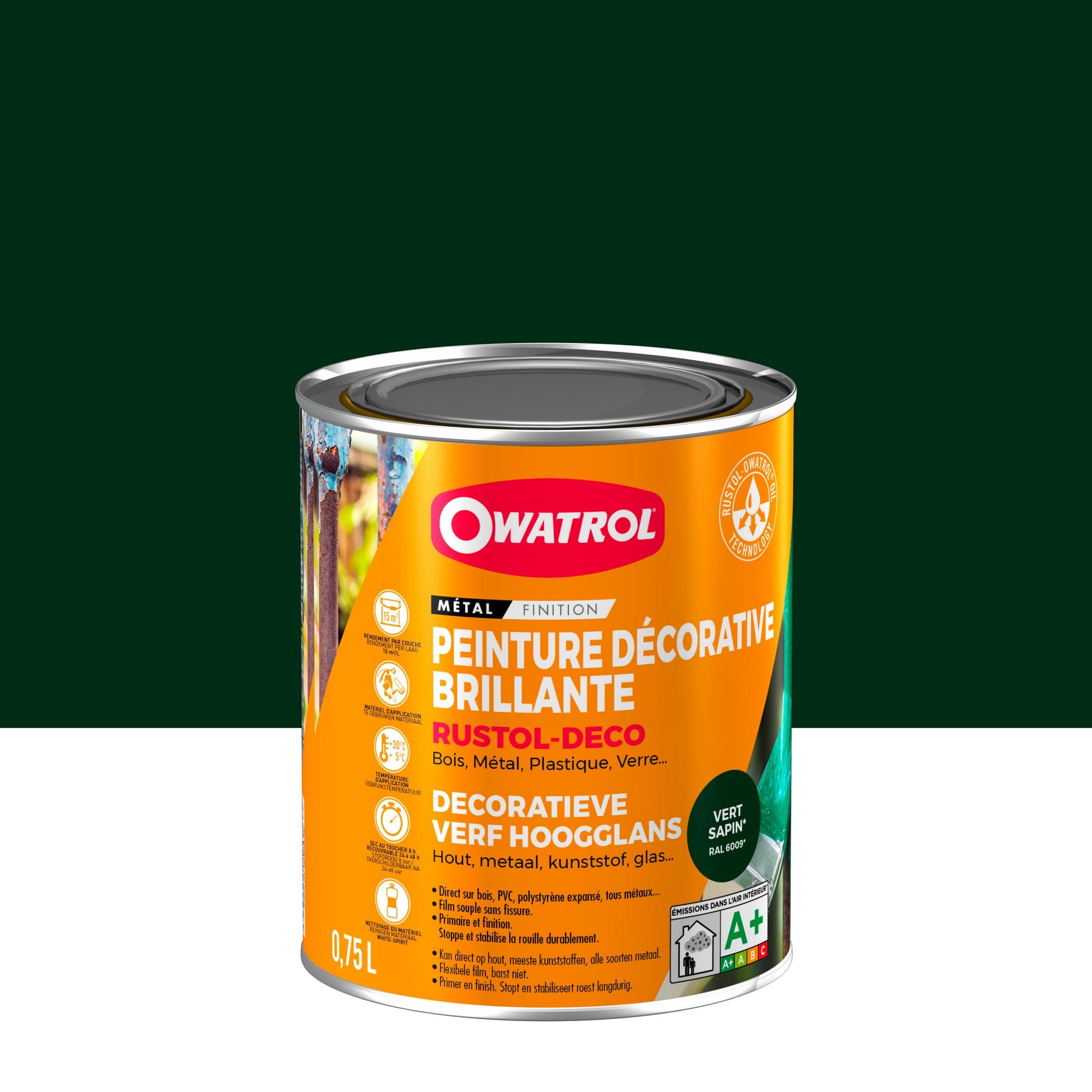 Peinture antirouille décorative Owatrol RUSTOL DECO BRILLANT Vert Sapin (RAL 6009) 0.75 litre