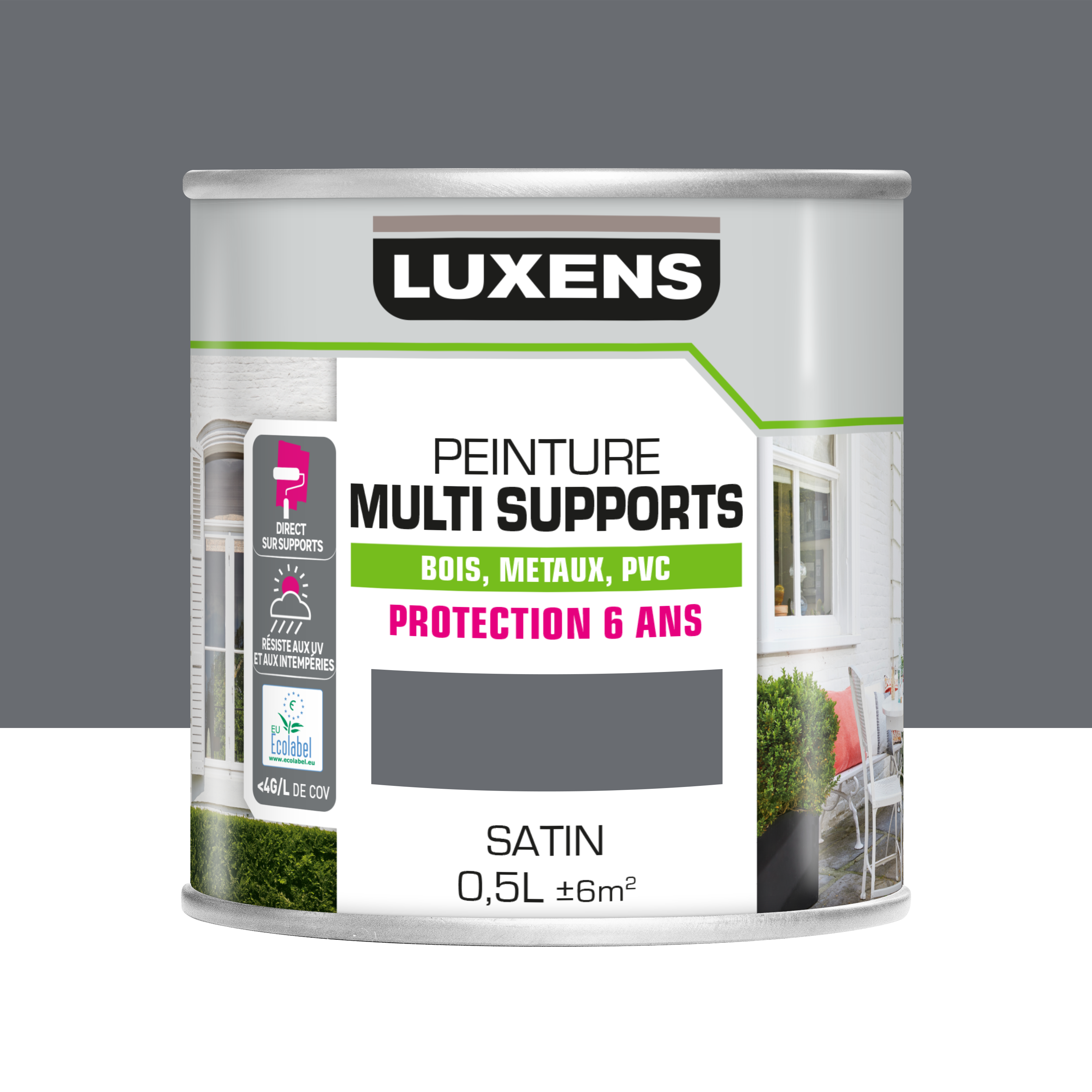 Cette peinture multi supports Luxens satinée est idéale pour les surfaces comme le bois, le métal, le PVC, etc. Grâce à sa résine acrylique, cette peinture peut être appliquée sur des supports comme des portes, portes, volets et meubles de jardin.Sa formule est résistante aux UV, aux variations de température, l'humidité et la météo pour assurer un résultat durable pendant 6 ans