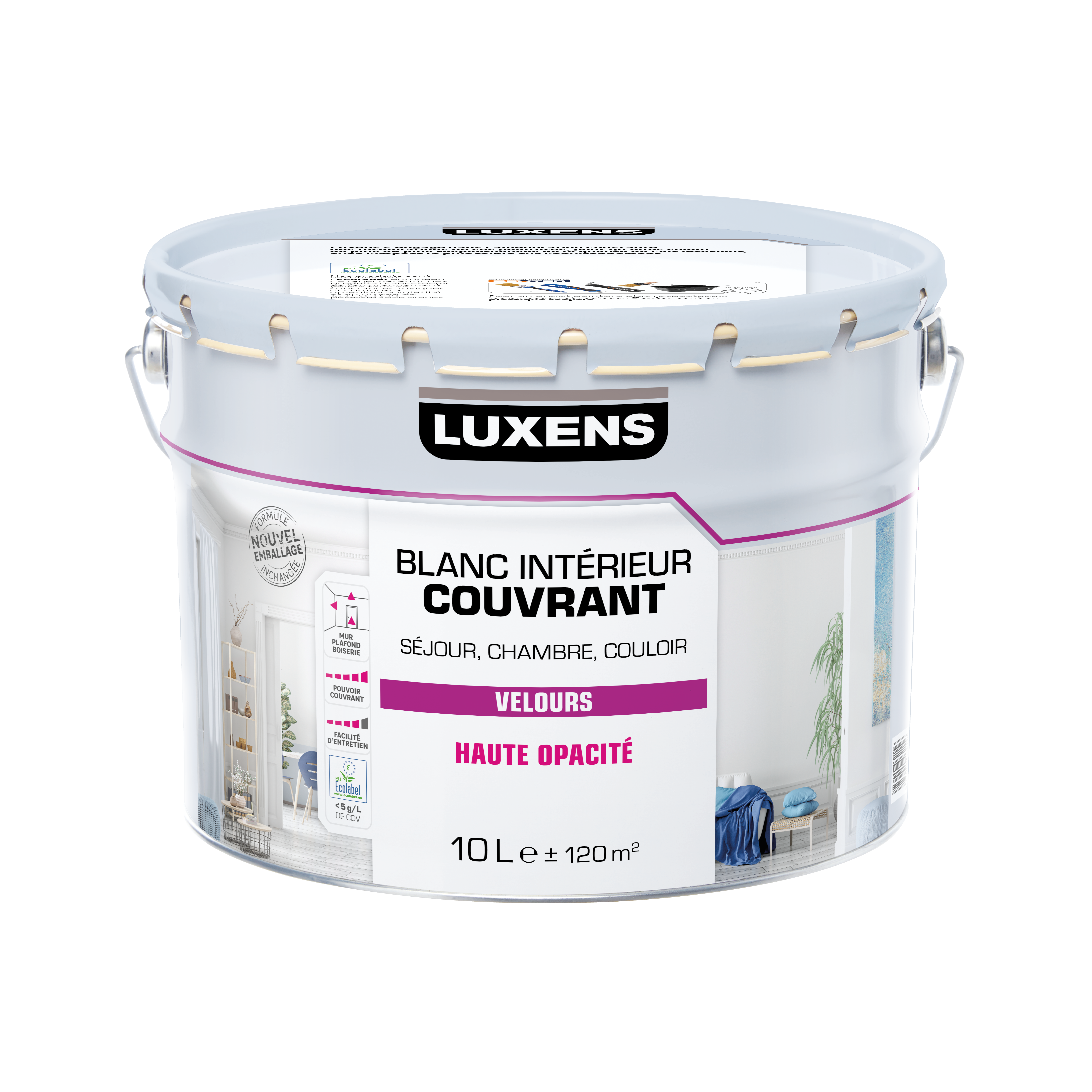 En savoir plusPeinture Luxens à haut pouvoir couvrant pour vos intérieurs (murs, plafonds, boiseries…). Sa formulation à base de résines acryliques de qualité (non jaunissantes) lui confère une grande opacité et vous garantit un blanc profond et un bel aspect velours. L'aspect velours, compromis idéal entre le mat et le satin, reflète peu la lumiere, estompe les défauts et s'entretient facilement. Lavable à l'éponge, elle est facile d'entretien. Notre peinture Luxens est Ecolabel, ce label certifie les produits pour leurs performances techniques, leur quantité limitée en substance dangereuse, et leur faible taux en composés organiques volatiles, inférieur à 5g/l de COV.