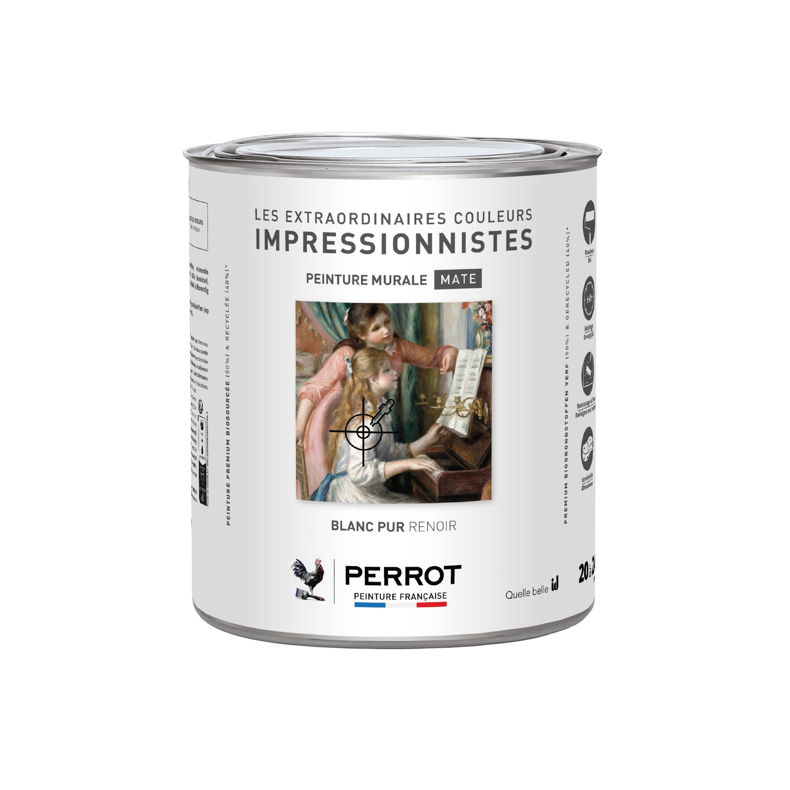 Les Impressionnistes sont les plus grands coloristes de tous les temps. Offrez à vos murs leurs extraordinaires couleurs intemporelles. Elles s'harmonisent aussi bien avec des intérieurs modernes que classiques. La peinture PERROT est une peinture murale mate premium biosourcée et recyclée (Formule contenant plus de 50% de carbone biosourcée selon la norme EN 16640 (issue de la biomasse) et 40% d'ingrédients issus du recyclage (sur le sec peinture). Caractéristiques – Conditionnement : 500ml et 2L – Rendement ± 12m² par litre – Outil d'application : rouleau – Finition mate PRÉPAREZ VOS SUPPORTS POUR UN RÉSULTAT IMPECCABLE Le support doit être sain, propre et sec. Sur anciennes peintures : lessivez et rincez à l'eau. Appliquez une couche de primaire à l'aide d'un rouleau ou d'une brosse large. Sur plâtre, plaques de plâtre et fonds poreux : poncez et dépoussiérez. Faites une 1ère application de primaire diluée avec 5% d'eau. Laissez sécher ±4h avant de faire une 2ème application pure. Ne pas appliquer sur papiers peints. APPLIQUEZ LA PEINTURE MURALE PERROT Bien mélanger avant application. 1. Appliquez la peinture avec un rouleau laqueur 5mm ou un rouleau mousse. Appliquez de manière régulière par surface de 1 à 2 m² pour éviter les traces de reprises. Croisez les couches en appliquant d'abord de haut en bas, puis de gauche à droite. Terminez en lissant de haut en bas. Laissez sécher 4h avant d'appliquer une 2ème couche.