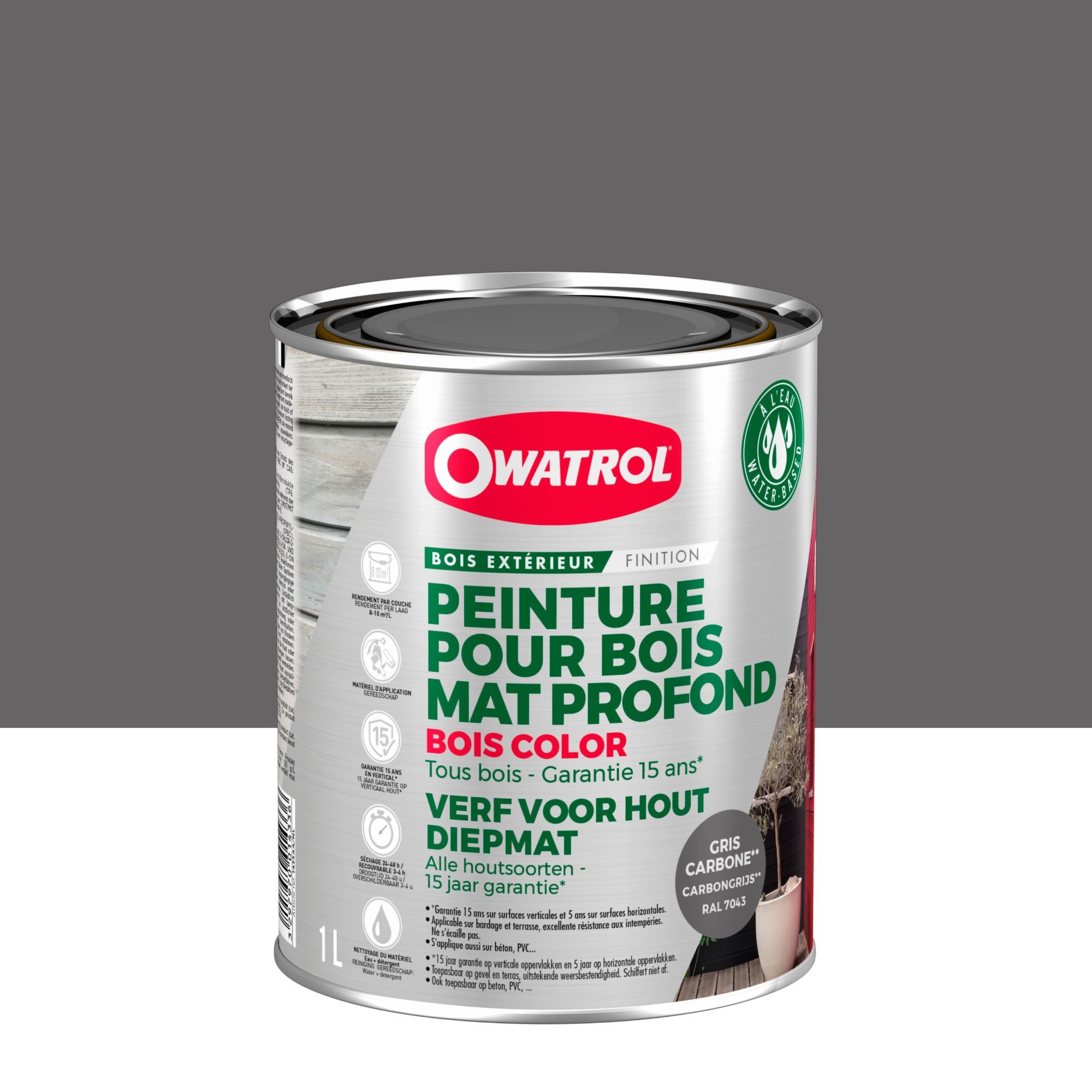Peinture pour bois extérieur opaque - Finition Mate Owatrol BOIS COLOR Carbone RAL 7043 1 litre