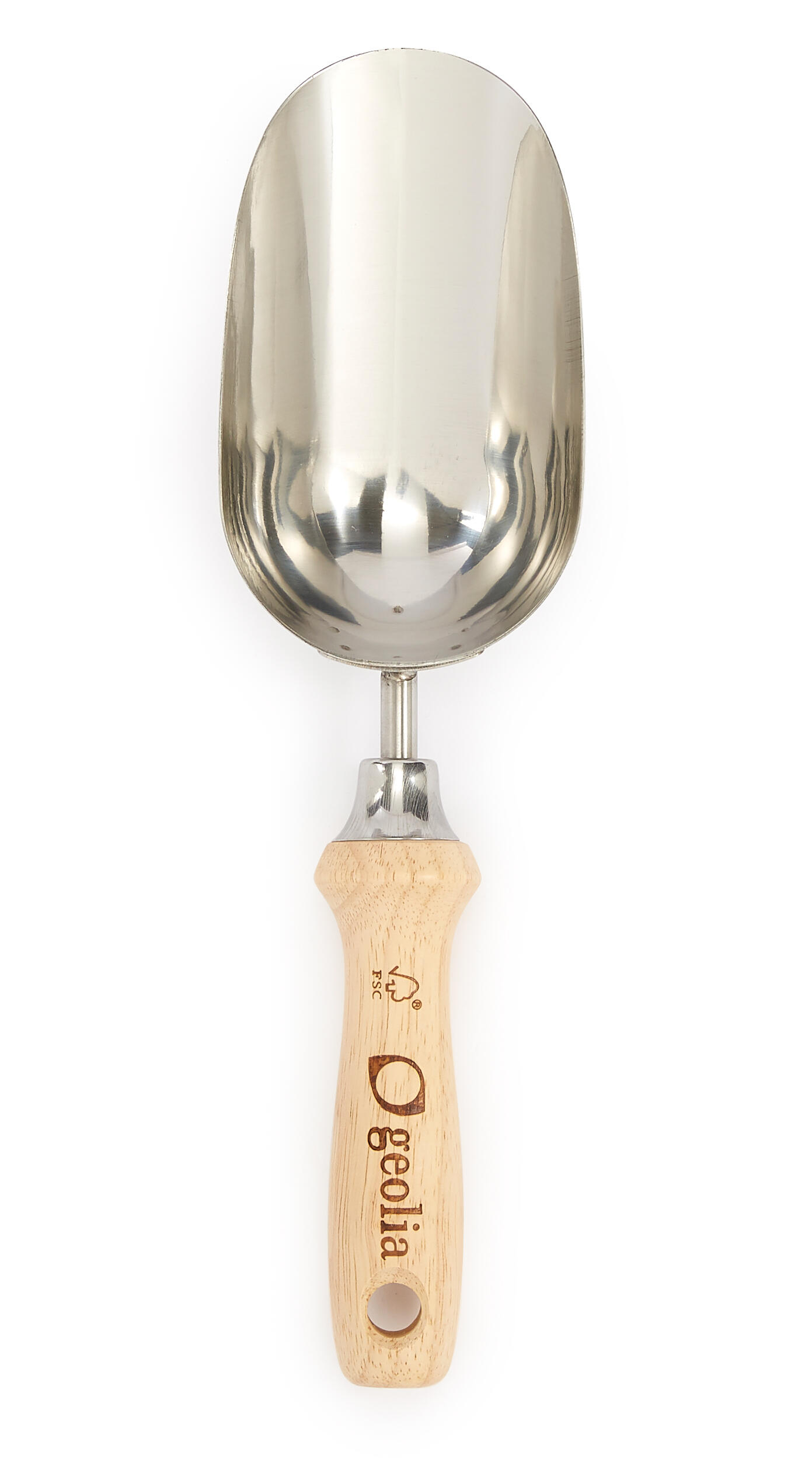 Pelle à main profonde Geolia, en acier inoxydable et manche ergonomique en bois qui rend le travail de jardinage plus confortable. Il possède le label FSC, qui certifie que le bois provient de forêts gérées de manière durable. Dimensions : 9 x 32 cm (largeur x longueur).