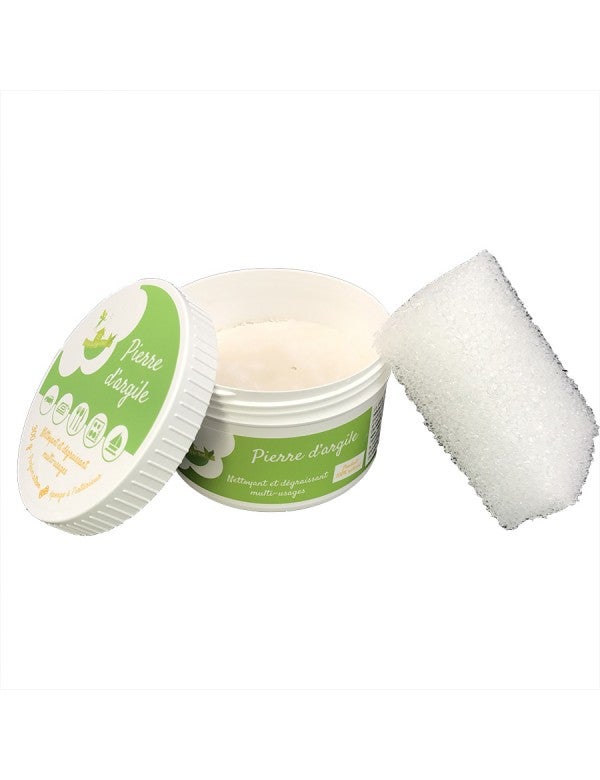 Elle entretient, soigne, ravive et imperméabilise. Un nettoyant universel : La Pierre d’Argile remplace de nombreux produits d’entretien spécialisés. Elle nettoie, entretien, dégraisse, enlève le tartre, polit et protège, sans rayer ! Elle laisse un léger parfum naturel de citron. Un produit 100% naturel : La Pierre d’Argile est composée d’argile blanche, d’huile essentielle de citron, d’eau et de savon naturel. C’est un produit non toxique sans phosphate, ni acide. Il n’attaque pas votre peau. Vous pourrez ainsi l’utiliser sans danger auprès de vos enfants ou encore en cuisine. Un produit économique : La Pierre d’Argile ne se dégrade pas avec le temps, et vous n’avez besoin que de très peu de produit pour nettoyer une multitude de surfaces et objets. Vous pourrez donc utiliser ce pot de 300g pendant plusieurs mois. - En cuisine : vitrocéramique, gazinière, vitre et grilles de four, plats brûlés ou graisseux, vaisselle... - Dans votre salon : insert de cheminée, joints de carrelage, vitres... - Dans votre salle de bain : lavabo, porte de douche, joints de salle de bains, robinetterie, bac à douche, baignoire, WC... - Autres utilisations : nettoyez votre fer à repasser, vos outils, vos murs et papiers peints, redonnez brillance à vos bijoux, lavez votre mobilier de jardin, tableau de bord et jantes de voiture, camping-car, coque de bateau, blanchissez les semelles de vos chaussures... - Utilisable sur tout type de surfaces lavables à l’eau : plastiques, inox, cuivre, chrome, étain, aluminium, argenterie, acrylique, émail, carrelage, pierre, lino, vitre, laiton, cuir...