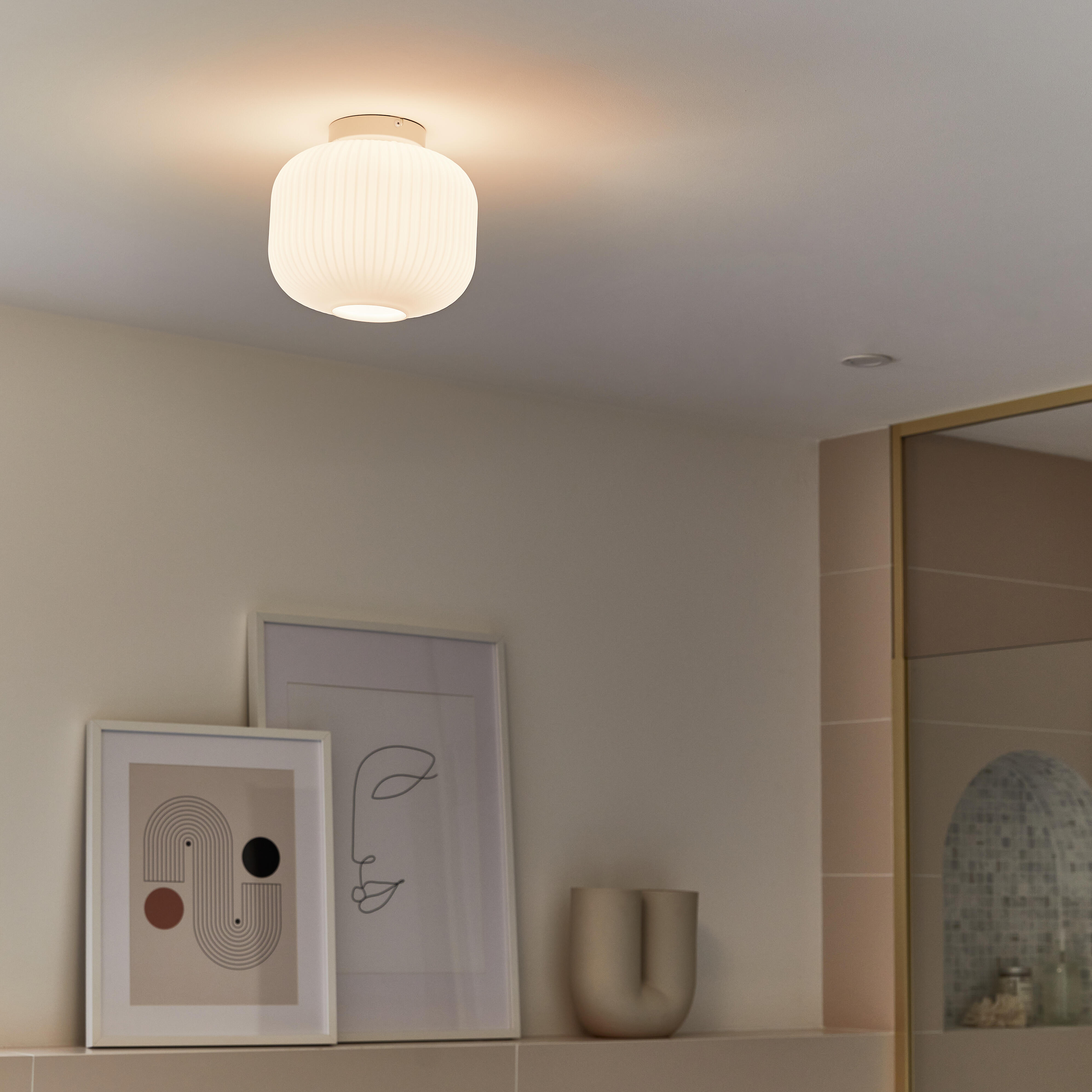 Avec ce plafonnier "Laguna" en verre et métal blanc, de 24 cm de diamètre, jouez la carte nature dans votre salle de bains avec sin indice de protection IP44 (hors zone douche et bains). Fonctionne avec une ampoule E27 vendue séparément pour vous permettre de choisir la couleur de lumière, plutôt chaude ou plutôt blanche, en fonction de vos envies. Si vous souhaitez coordonner vos luminaires, retrouvez le spot et la barre de 2 spots Laguna sur notre site internet.