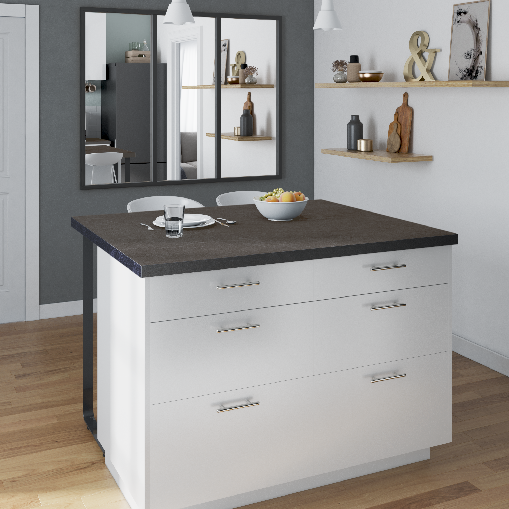 Les plans ilôts standard s'adaptent parfaitement à une configuration d'îlot composé de 2 caissons standard L60cm associés à un espace repas de 40cm (avec des pieds de plans) ou bien deux caissons L60cm en profondeur 35cm. Leur revêtement stratifié permet une grand variété de décors couplée à une résistance importante à la rayure et un entretien aisé.