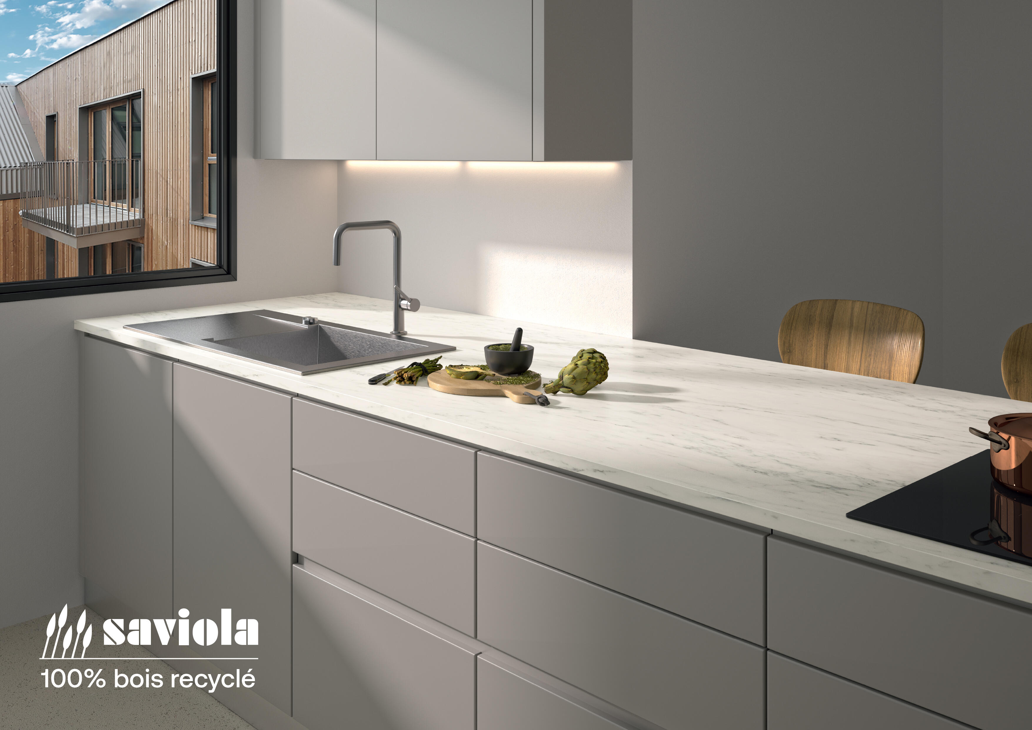 Plan de travail effet Marbre Blanc épaisseur de 28mm. Un finition classique effet marbre blanc mat, simple d'entretien. Les plans de travail sont fabriqués à partir de matériaux 100 % recyclés. Vous améliorez ainsi non seulement l'aspect de votre cuisine, mais aussi la santé de la planète.