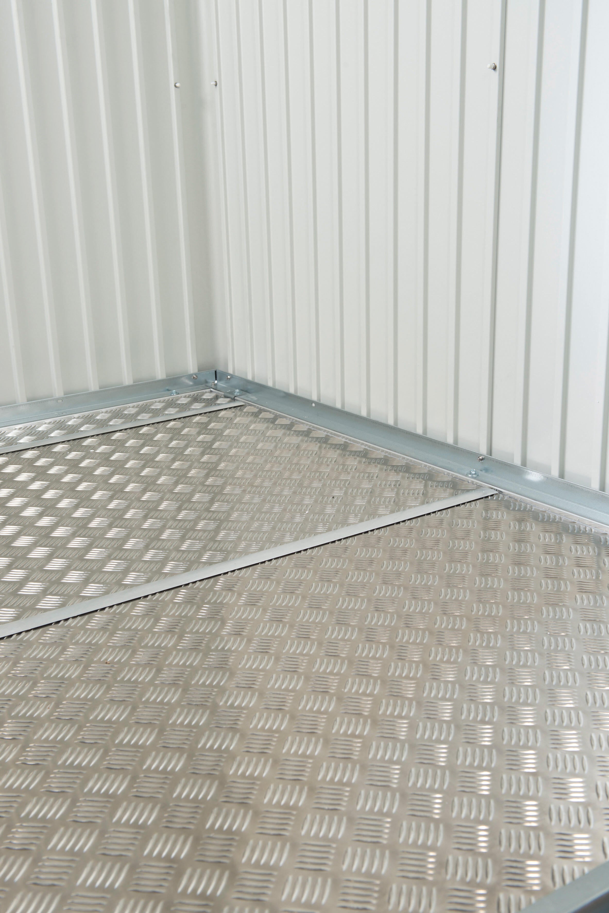 Sol d’aluminium en tôle striée de haute qualité, élégant et fonctionnel. Le sol se compose, selon la taille de l’abri, de 1 à 4 plaques y compris les glissières d’assemblage. Le cadre de sol est nécessaire à l’installation optimale de la plaque de fond. Veuillez noter que le sol ALU doit être recouvert d'un revêtement ou de plaques Styrodur d'une épaisseur d'environ 2-3 cm (non compris dans la livraison).