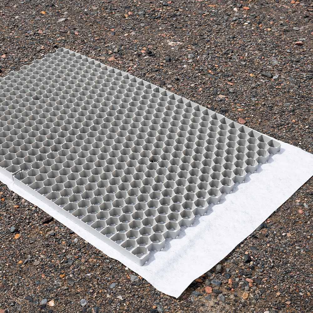 La structure en nid d’abeille assure une excellente répartition des charges pour un sol stable et résistant. Le géotextile thermosoudé empêche le gravier de migrer sous la plaque et maintient une surface plane.