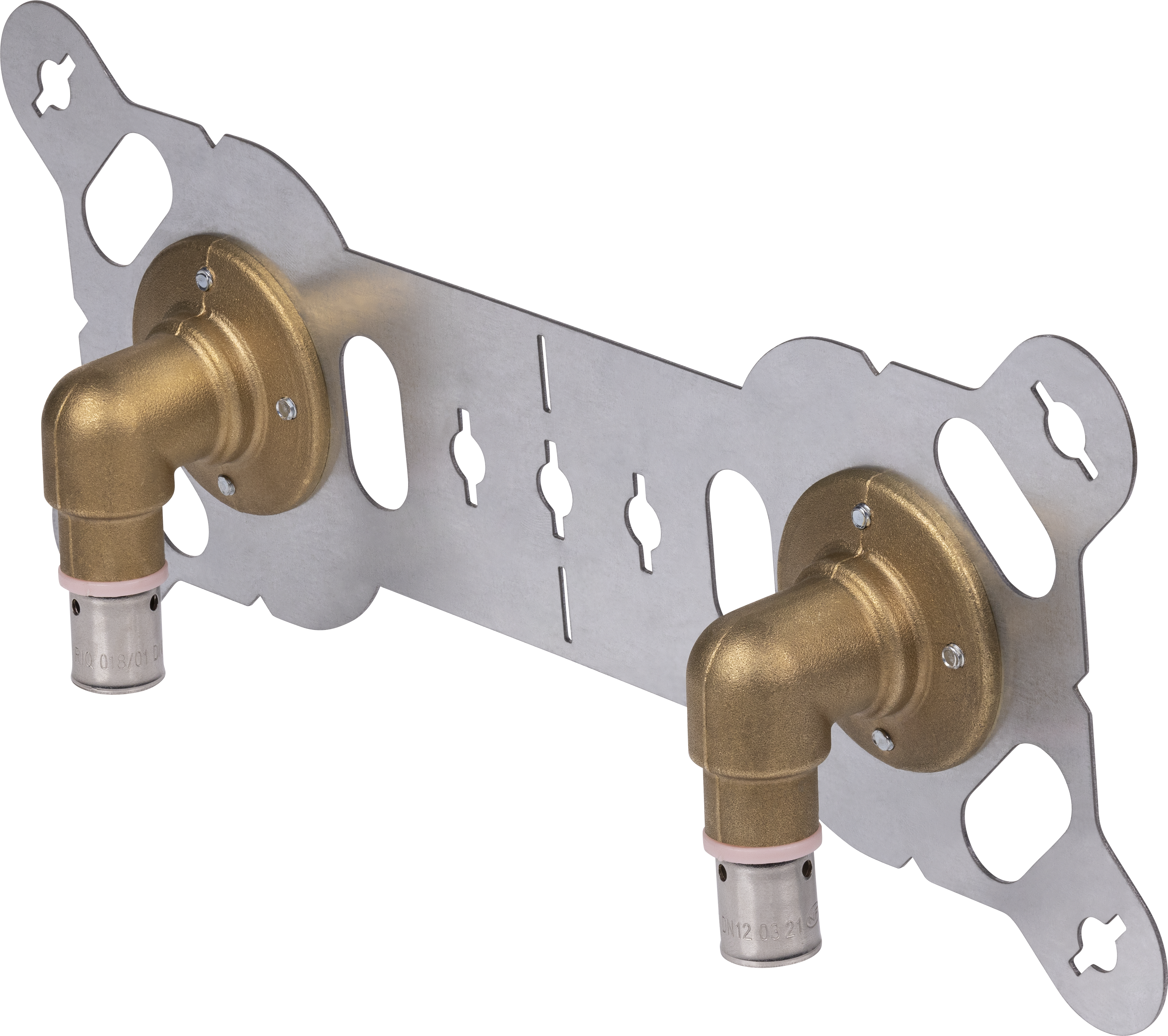 Entraxe 150 mm - Platine sécable : pour 1 robinet double ou 2 robinets simples - Raccords pré-montés - Raccordement sur tube PER Ø12, à sertir - Raccords orientables suivant le sens d’arrivée de l’eau (horizontale ou verticale) - Composition: 1 platine double sécable / 2 coudes de raccordement sur tube PER pré-montés / 2 bagues laiton Ø12 / 6 chevilles à expanser ;