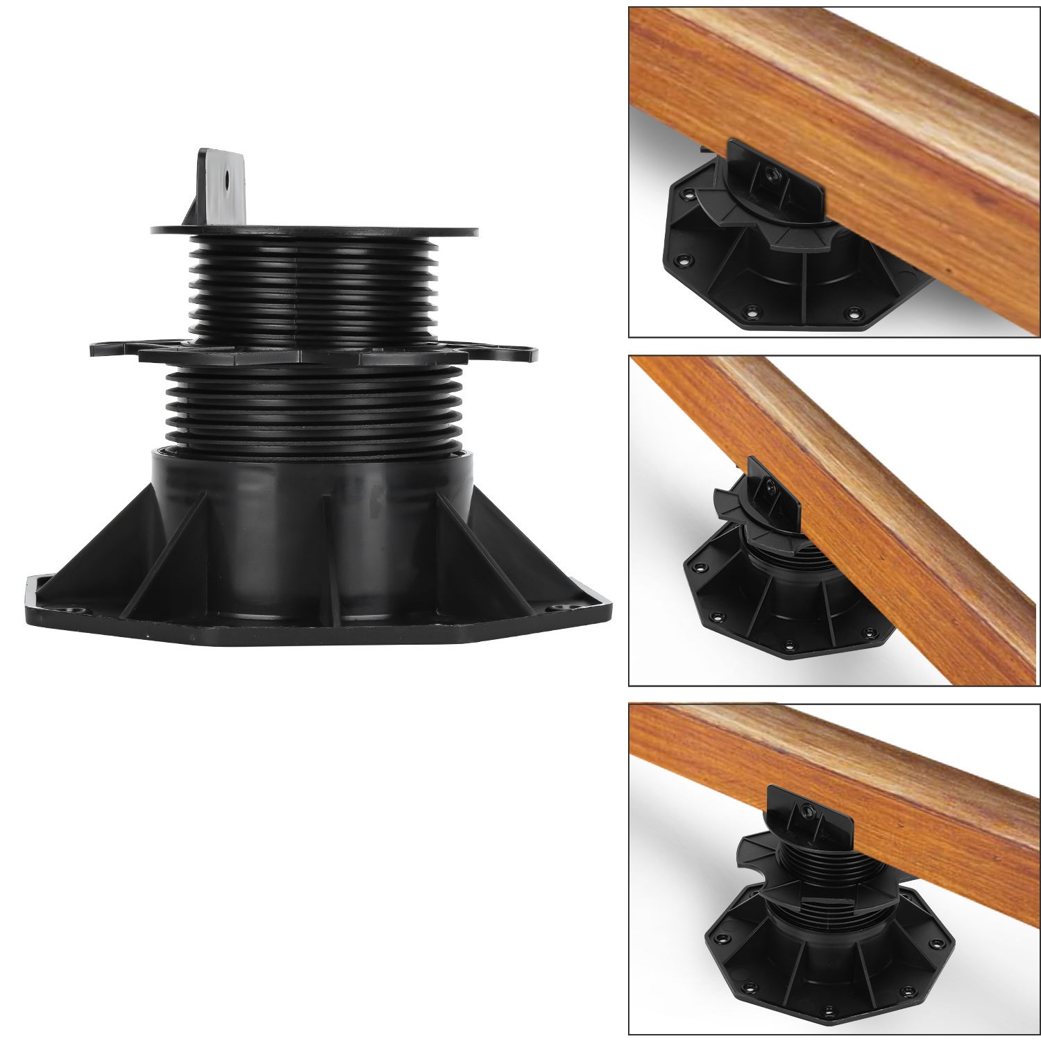 Les pieds réglables vous permettent une "pose à sec" de dalles ou de lames de terrasse. Grâce à leur réglage en continu vous pouvez égaliser les sols jusqu'à 140 mm. De plus grâce à la pose sur plots vous profitez d'un drainage très rapide de la ace de la terrasse.