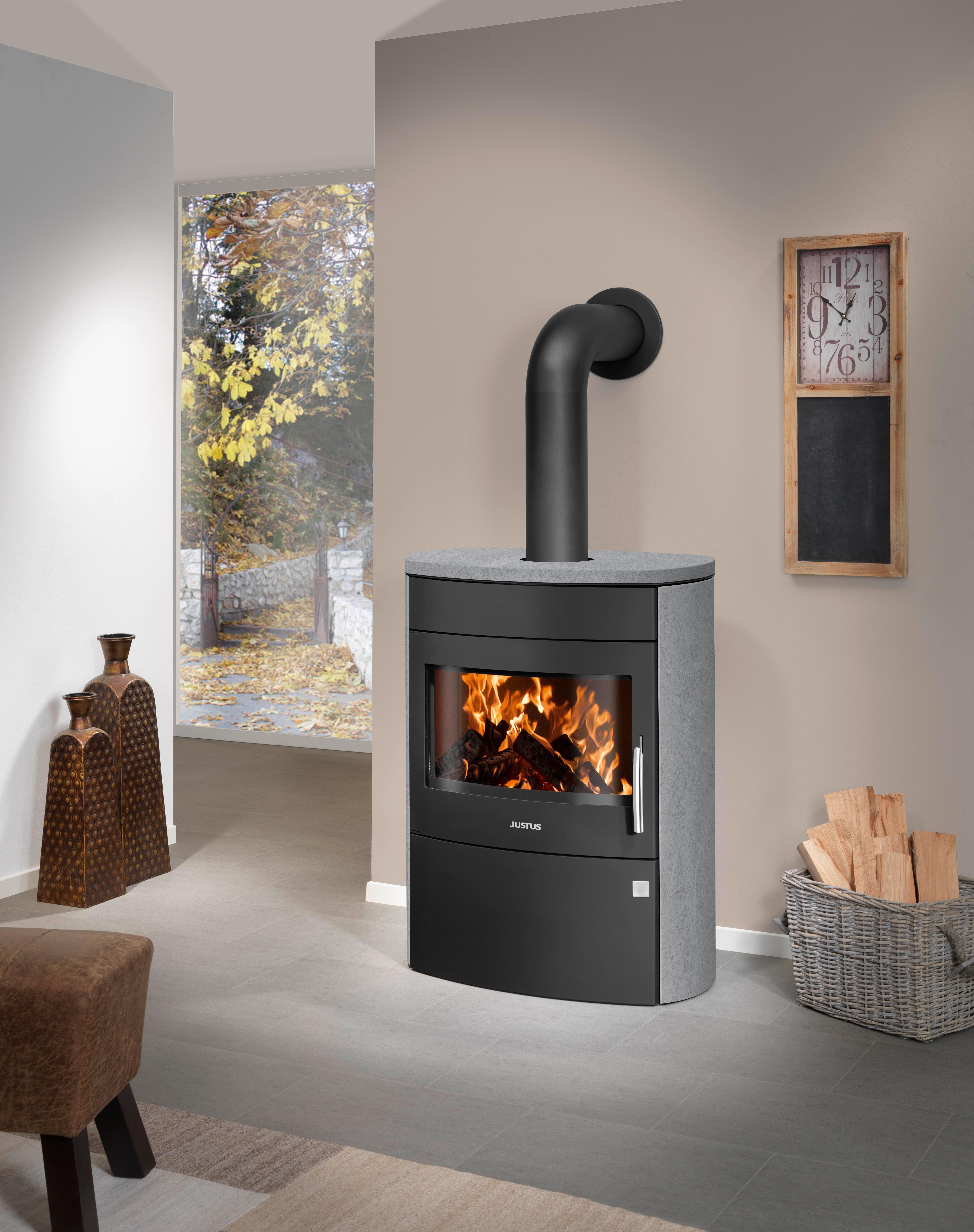 Poêle bois de forme elliptique, acier noir dessus et cotés pierre ollaire, puissance 7 kw, pouvant recevoir des buches de 50 cm, rendement 80,3%, vitre galbée ,verrouillage porte deux points, compatible RT 2012