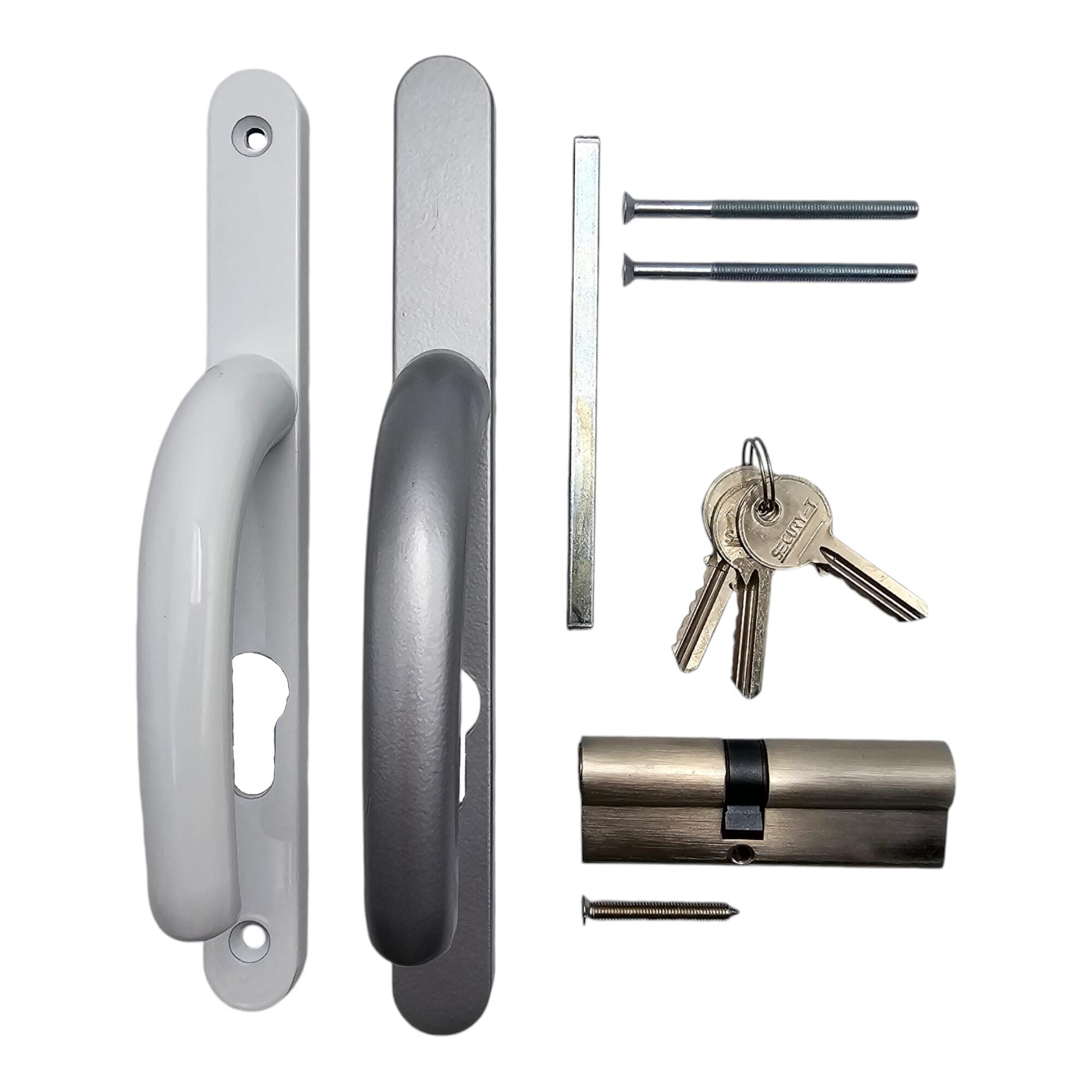 Permet d'équiper votre porte d'entrée, de service ou porte fenêtre PVC, qu'elle soit Blanche ou Gris Anthracite. Poignée intérieure blanche, extérieure grise. Kit composé de : 2 demi poignées, 2 carrés, 4 vis d'assemblage, 1 cylindre Européen 40x50 avec 3 clés, 1 vis de cylindre