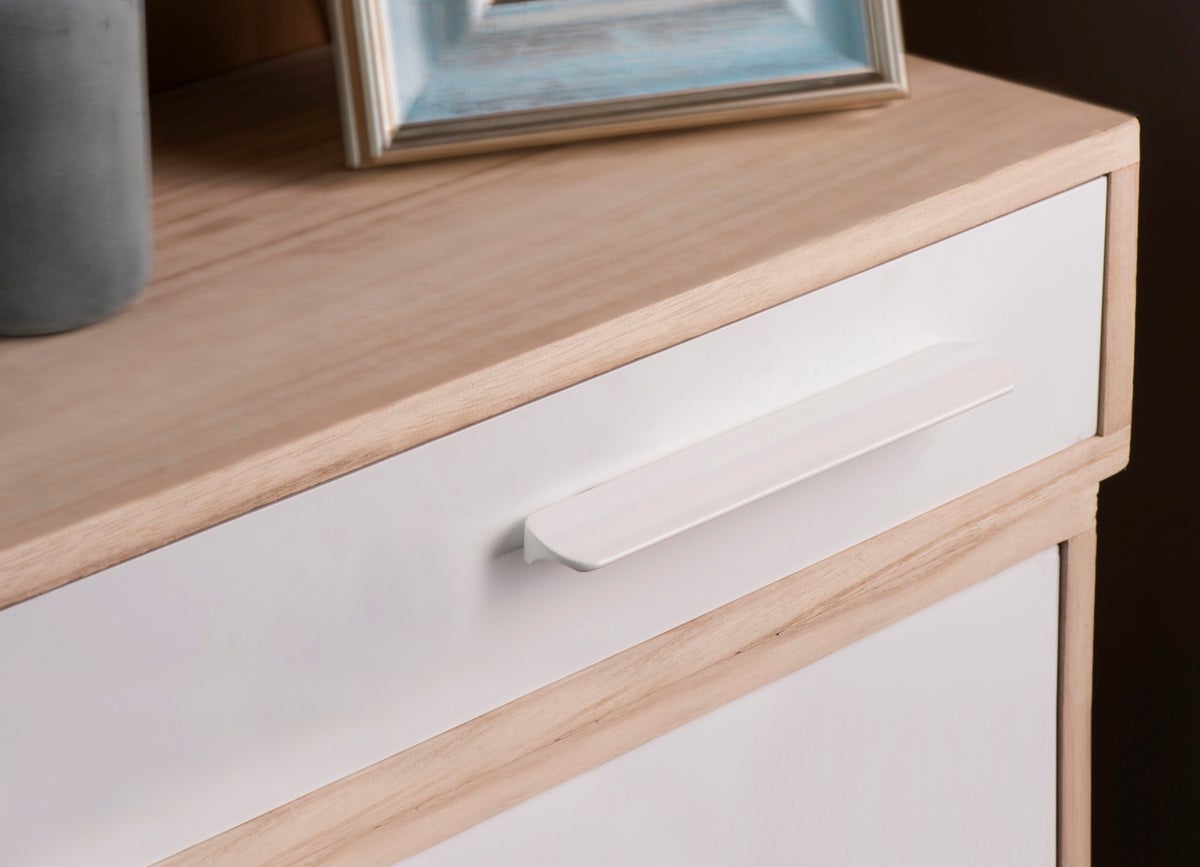 Poignée métallique 128mm, en aluminium blanc. Installation facile, comprend des vis métriques M4 25mm. Dimensions: Longueur 151 x Largeur 8 x Profondeur 20 mm. Contient 1 unité en sachet individuel.