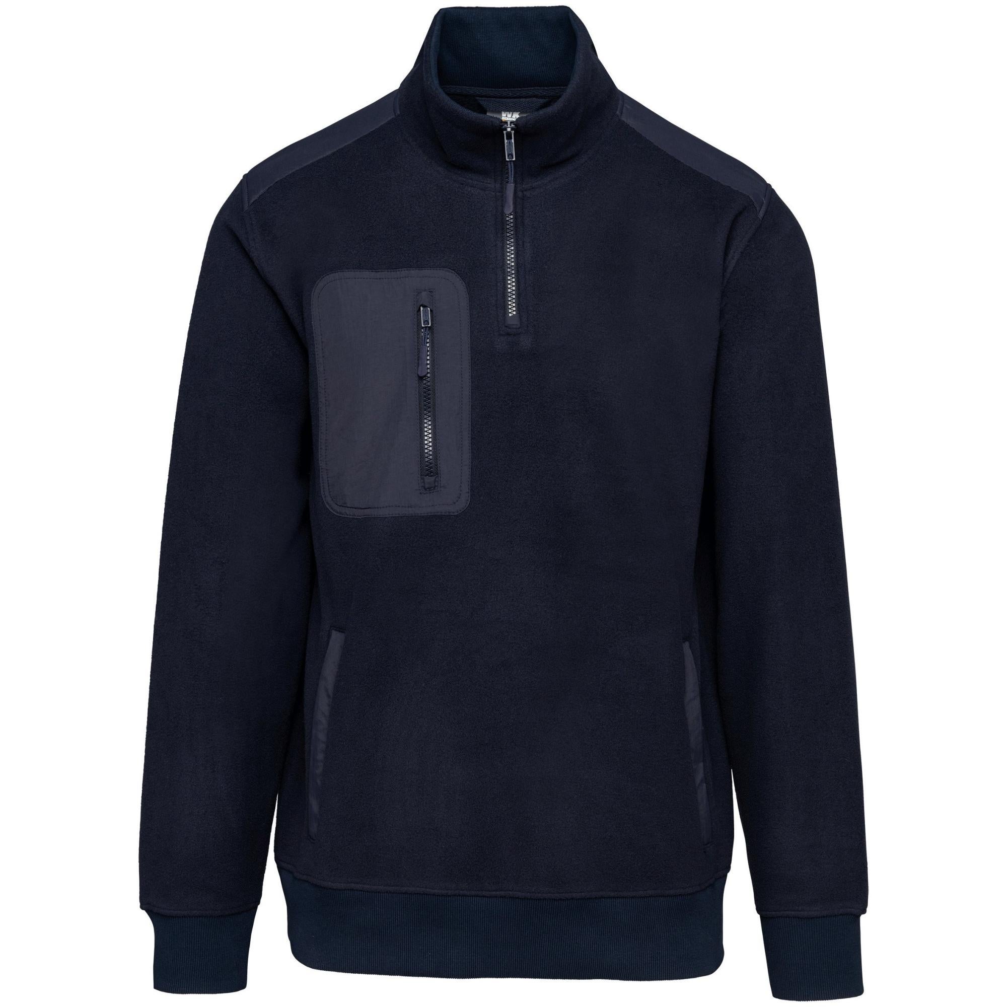 100% polyester recyclé. Coupe droite. 2 poches zippées passepoilées en taslan devant avec tire-zip. 1 poche poitrine arrondie zippée avec tire-zip côté droit au porté en taslan avec surpiqûres ton sur ton. Col doublé avec côte 2 x 2 et zip en plastique recyclé + lien d'accrochage intérieur col. Empiècements de renfort épaules et avant bras en taslan. Bord-côtes tubulaire en rib 2 x 2 aux bas de manches et de vêtement. Etiquette de marque détachable.
