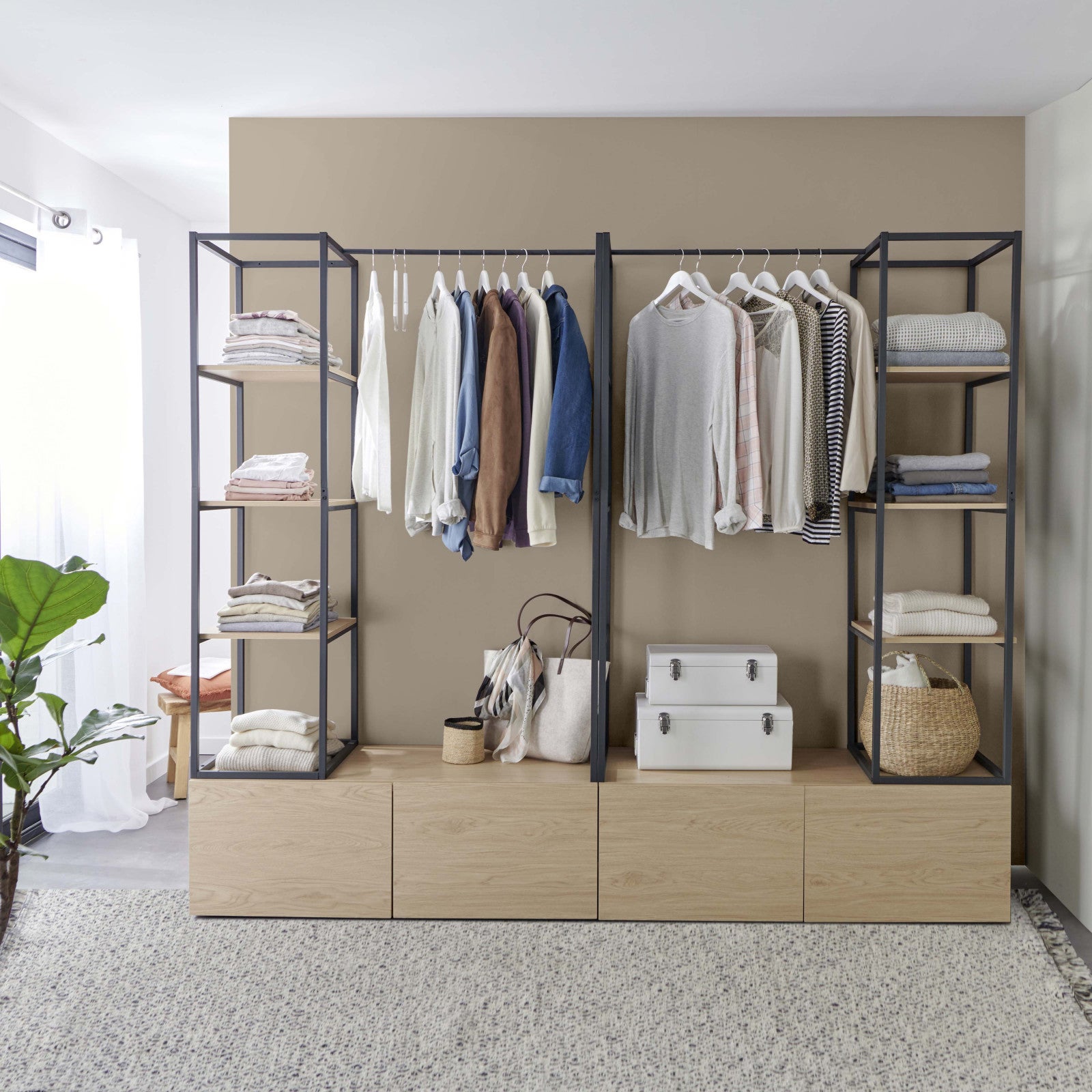 Le lot de 2 portants dressing KLEID s'avère idéal pour aménager une entrée ou une chambre avec style et fonctionnalité. Cet ensemble de penderies de rangement accueille avec élégance vos vêtements, chaussures et accessoires. Équipé de 8 étagères, de 2 barres de penderie et de 4 caissons de rangement, ce duo a été conçu pour vous faciliter le quotidien. Vous pouvez moduler les étagères en les plaçant à droite ou à gauche selon vos besoins.