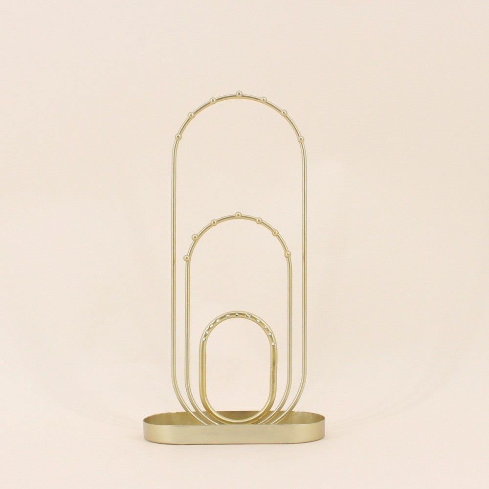 - Le porte bijoux doré de la collection Léandre mesure 30 cm de hauteur. - Conçu en métal, il se marie à toutes les ambiances, qu'elles soient contemporaines ou traditionnelles. - Compact, il s'intègre facilement sur une coiffeuse et offre un espace suffisant pour vos boucles d'oreilles, bracelets et colliers.Astuces déco : ajoutez-le près d'un miroir pour sublimer vos accessoires.