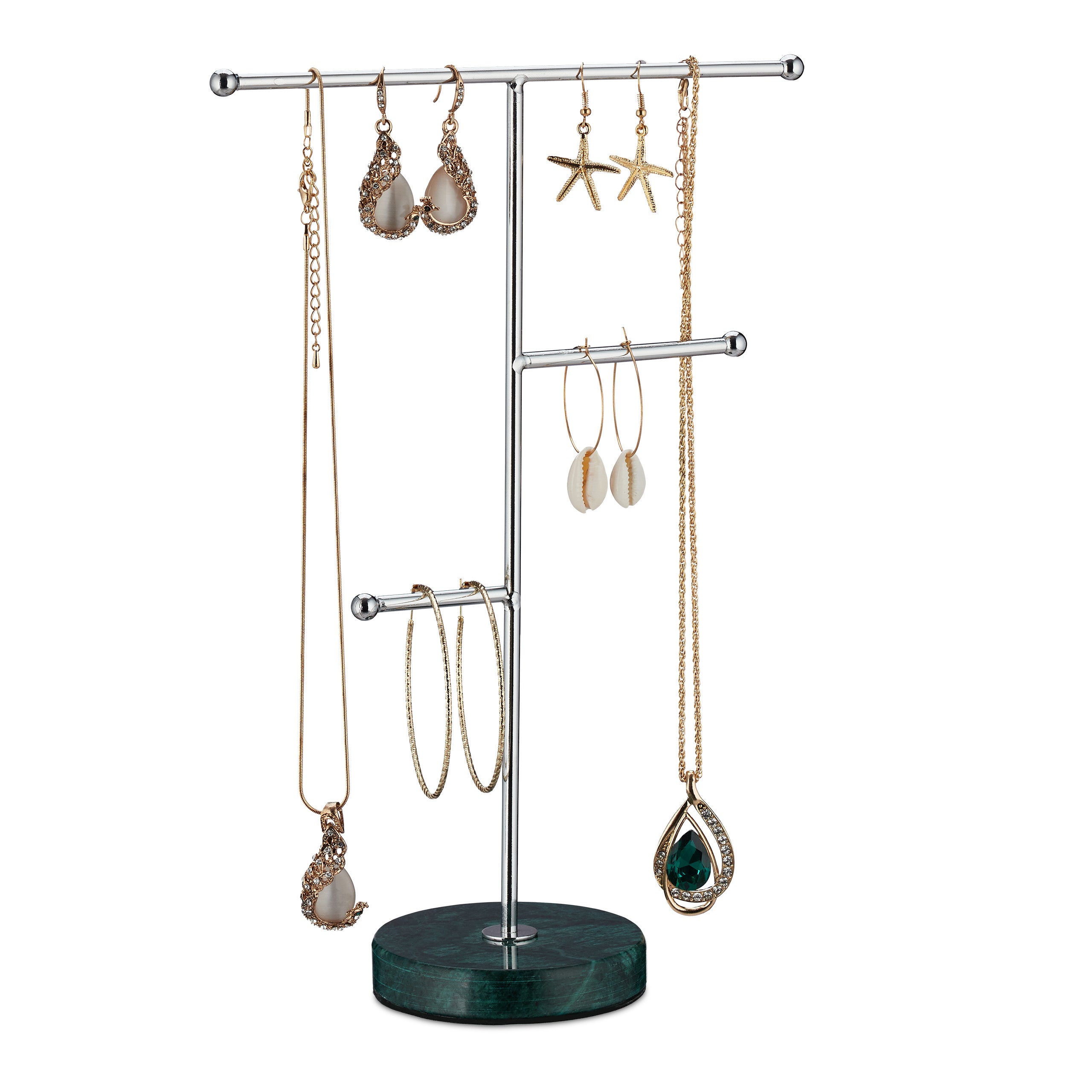 Porte-bijoux, pied en marbre, rangement pour colliers, boucles d’oreilles & bracelets, barres, vert/argent, Relaxdays