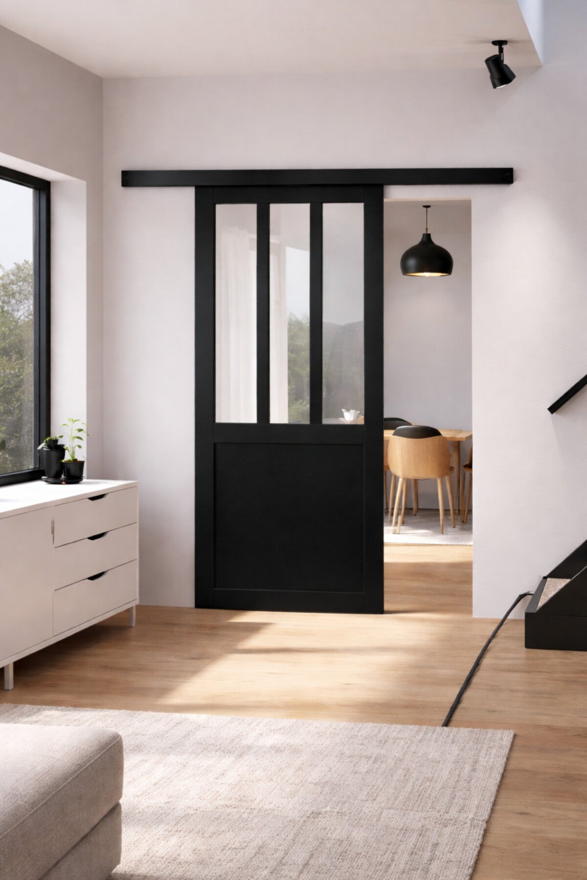 Porte coulissante Atelier Noir vitree H204 x L73 avec rail aluminium bandeau noir La porte coulissante Atelier Noir vitree est ideale pour structurer vos espaces interieurs avec elegance tout en laissant circuler la lumiere. Fabriquee en MDF enrobe noir et conçue en France, elle est equipee d'un vitrage clair transparent de 4 mm, apportant luminosite et caractere a vos amenagements. Avec ses dimensions de H 204 x L 73 cm, cette porte associe robustesse et esthetisme. Elle est livree avec un rail coulissant en aluminium avec bandeau noir, vendu avec la porte. Le rail de 190 cm, recoupable, est dote d'un cache-rail en aluminium noir, garantissant une finition soignee et un coulissement fluide. Conçue exclusivement pour un usage interieur, cette porte doit etre installee dans un espace chauffe et isole, afin d'assurer sa durabilite et ses performances dans le temps.