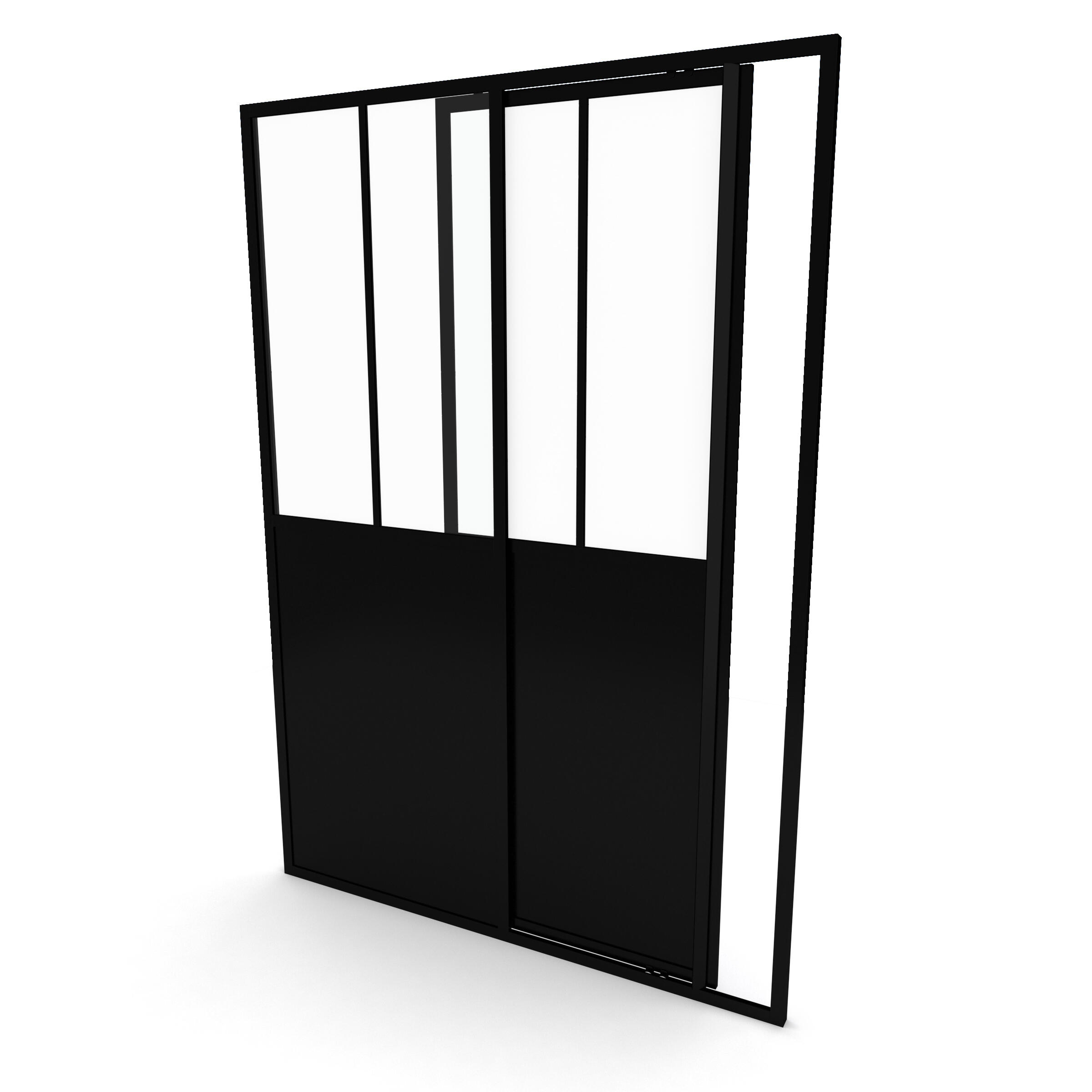 En savoir plusPorte coulissante style industriel "esprit verrière" en 120 x 200cm. Structure en aluminium laqué noir mat. Profilés de fixation mural ajustable de 119 à 121cm (+/-1cm). Porte en verre trempé 5mm et panneau en aluminium composite 5mm. Poignée en métal laqué noir mat, fermeture magnétique et montage réversible.