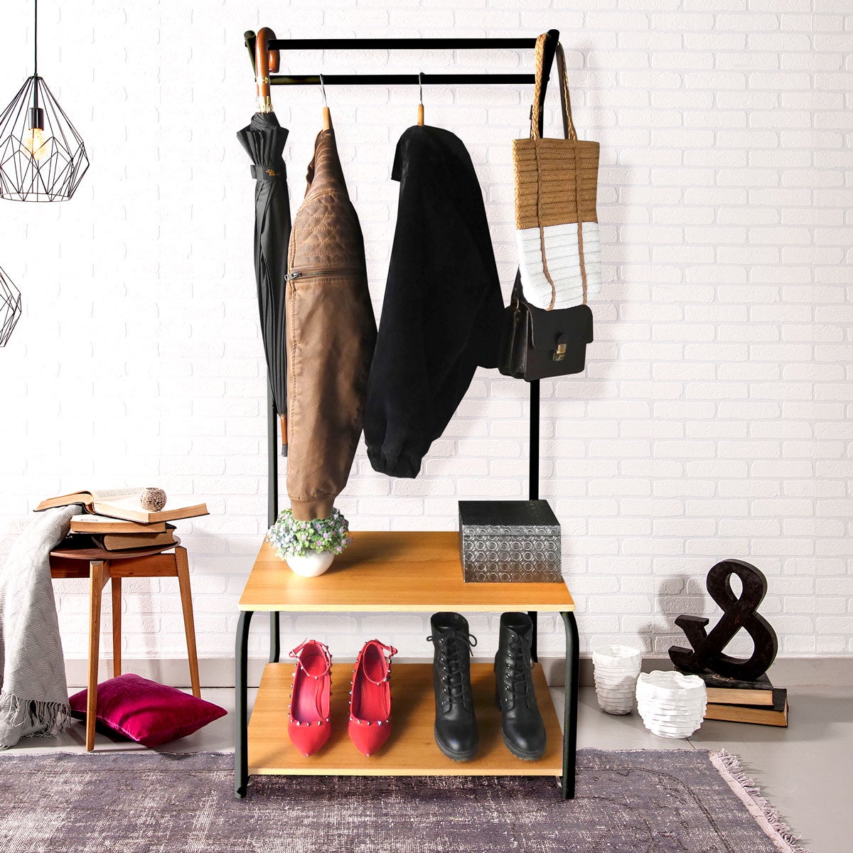 Portemanteau avec structure en métal de haute qualité et plateau en bois marron. Design élégant et vintage pour donner un style vintage au salon, chambre, couloir...etc... Pieds en caoutchouc réglables pour s'adapter à toute irrégularité et éviter de rayer le sol. C'est une conception parfaite pour stocker des objets et économiser de l'espace. Assemblage facile. Deux étagères en bois pour chaussures et autres accessoires tels que sacs, boîtes de rangement...etc. Dimensions : 40 (profondeur) x 60 (longueur) x 150 (hauteur) cm.
