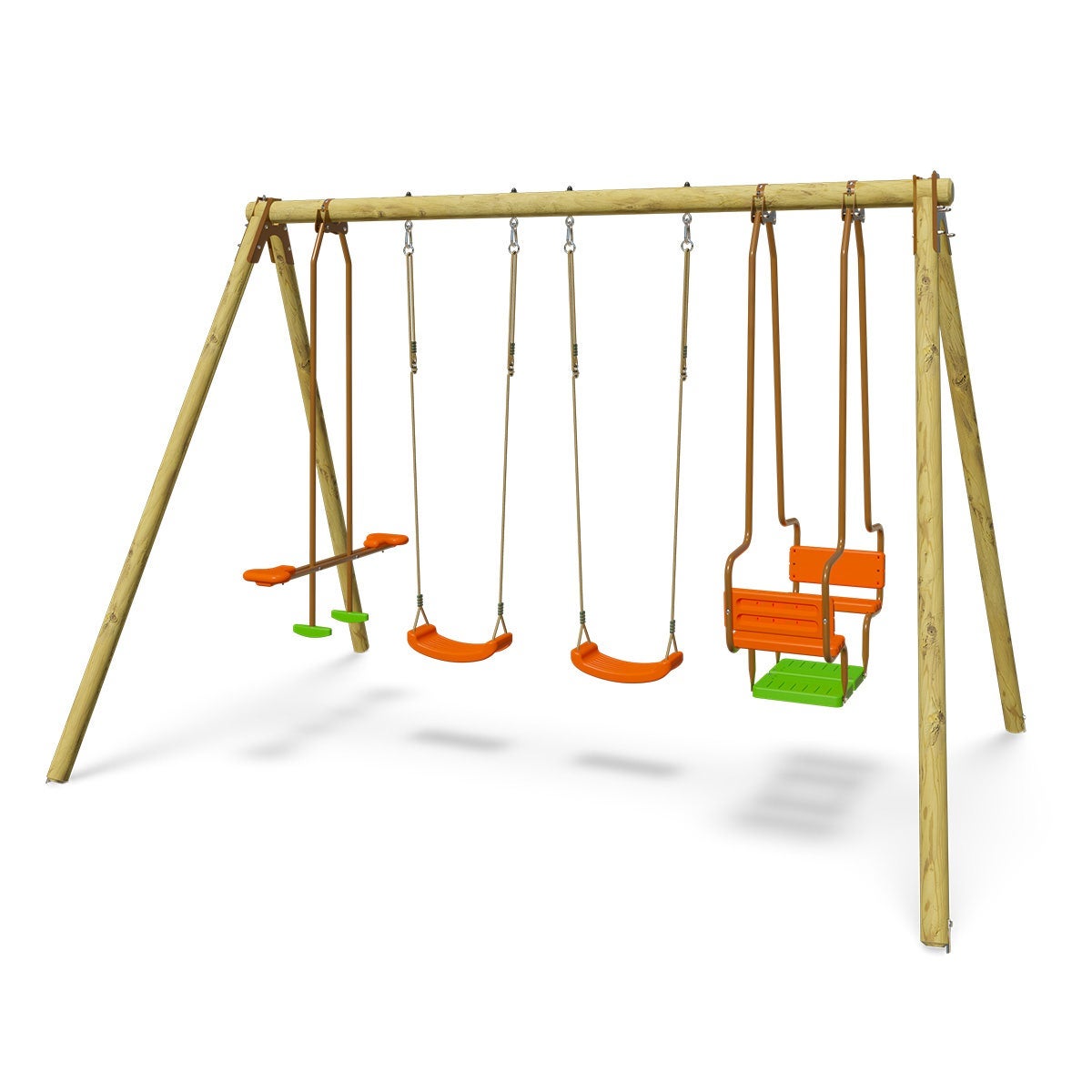 Ce portique très complet inclut 2 balançoires réglables, un face-à-face et une nacelle pour varier les activités. Parfait pour développer équilibre, coordination et imagination, tout en profitant du jardin.