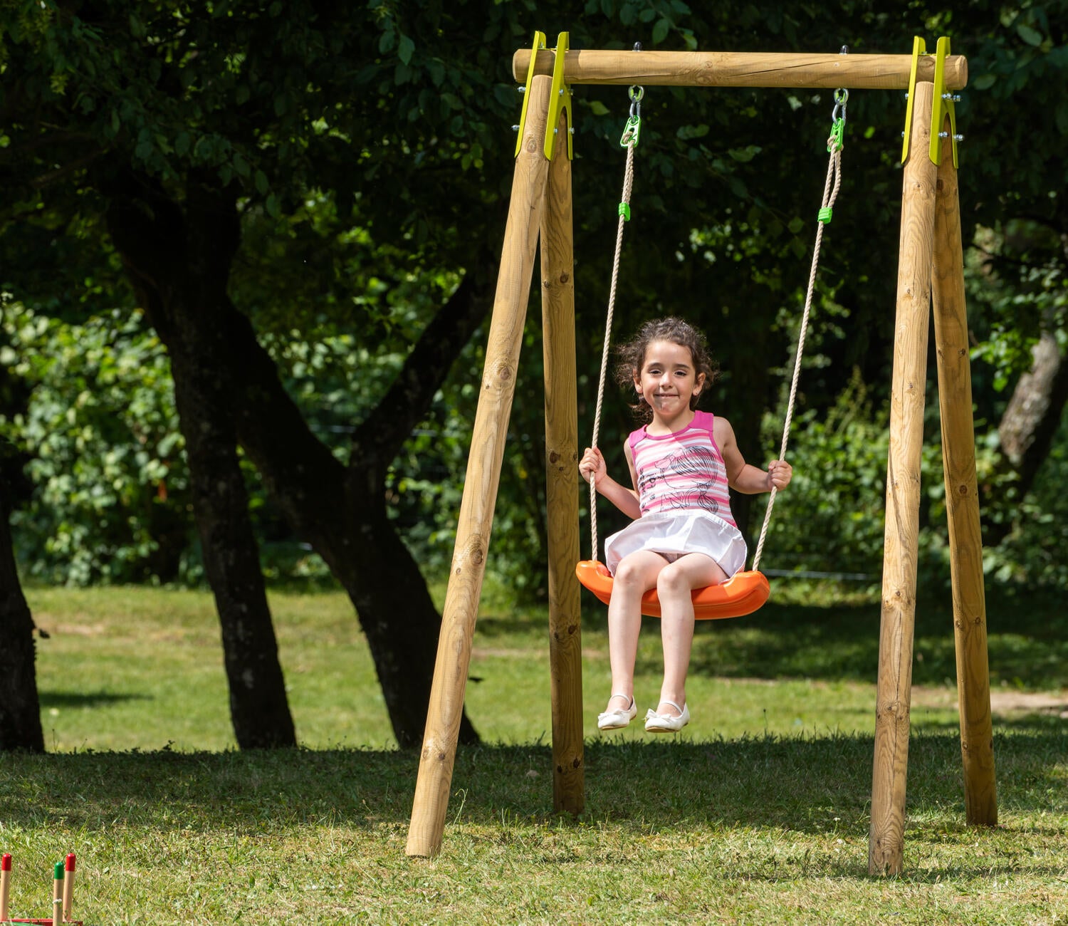 Portique bois 1.90 m de hauteur équipé de 1 balançoire plastique orange soufflée réglable par mousquetons. Pieds et poutre en pin traité autoclave classe IV. Diamètre poutre et pieds 80 mm