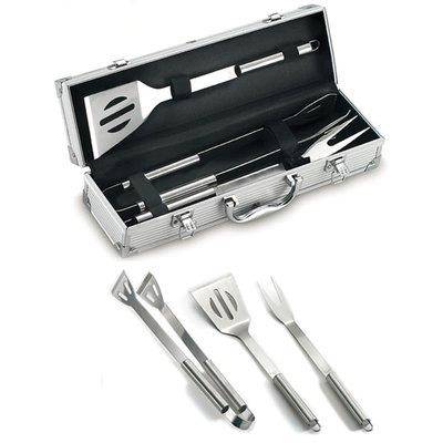 In acciaio inox. Completo di valigetta in alluminio. Il set comprende: forchettone, paletta e pinza.