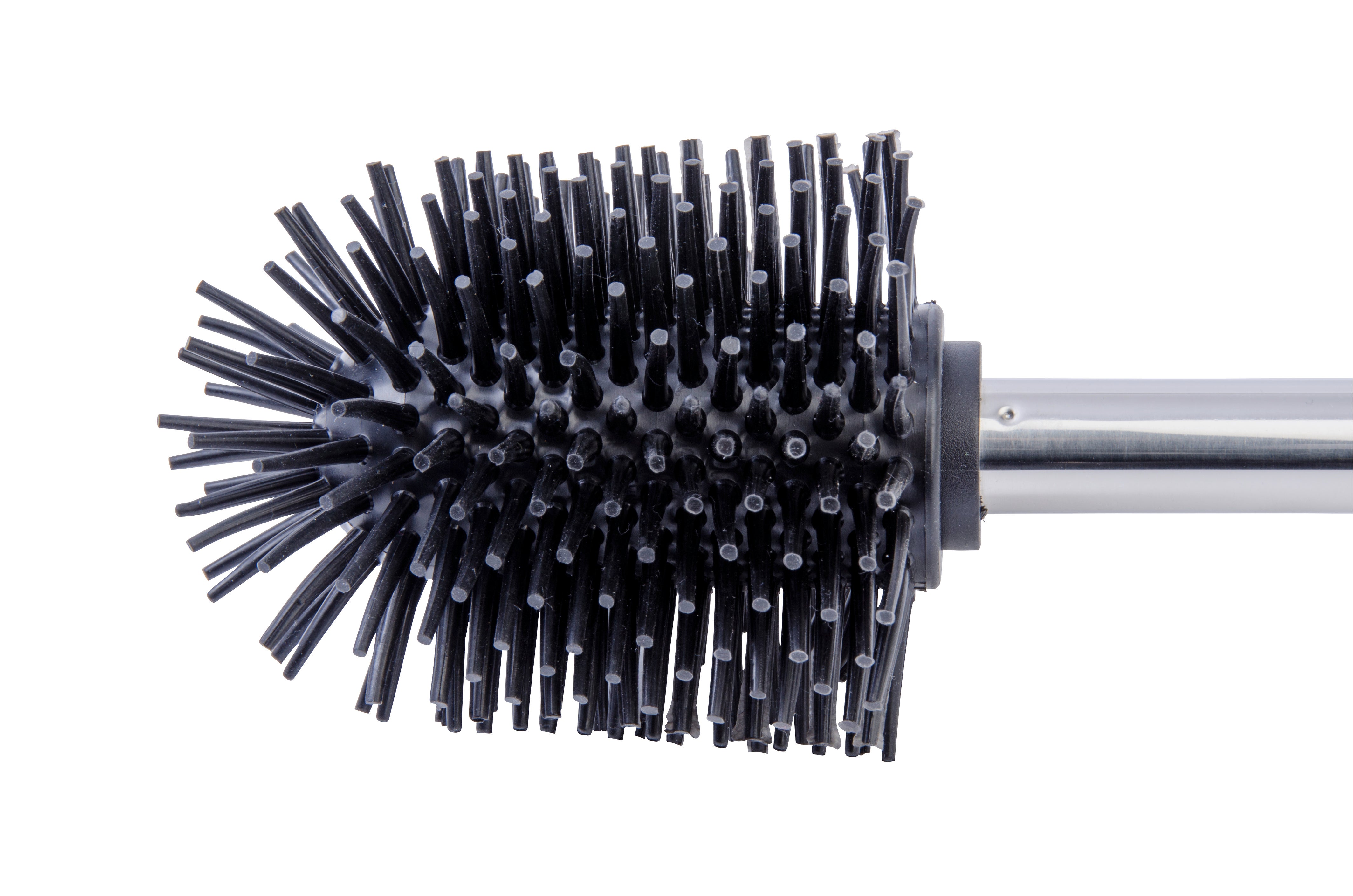 Tête de brosse WC en silicone. Un effet antiadhésif spécial empêche l'incrustation de résidus persévérants et de papier hygiénique dans la brosse, ils sont emportés tout simplement lors du nettoyage. Avec tête de brosse remplaçable.