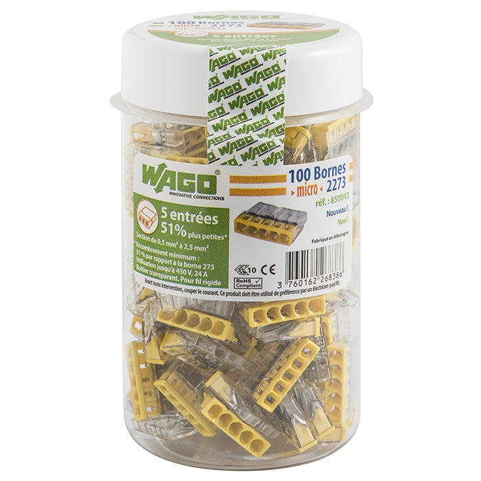 Nombre total des points de serrage : 5 Tension de référence EN [V] : 450V Surtension transitoire de référence [kV] : 4kV Courant nominal [A] : 24A Type de connexion : PUSH WIRE® Raccordement possible : 0.5 à 2.5 mm² Possibilité de contrôler visuellement la connexion grâce au boîtier transparent Doté d'un point de test Longueur de dénudage : 11 mm Largeur : 22 mm Hauteur : 5.8 mm Profondeur : 16.7 mm