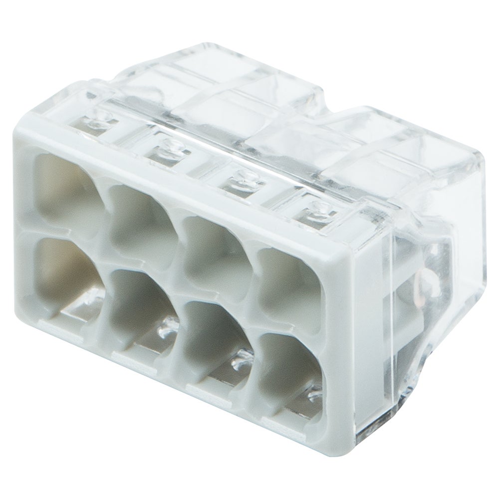 Nombre total des points de serrage : 8 Tension de référence EN [V] : 450V Surtension transitoire de référence [kV] : 4kV Courant nominal [A] : 24A Type de connexion : PUSH WIRE® Raccordement possible : 0.5 à 2.5 mm² Possibilité de contrôler visuellement la connexion grâce au boîtier transparent Doté d'un point de test Longueur de dénudage : 11 mm Largeur : 18 mm Hauteur : 10,4 mm Profondeur : 16.7 mm