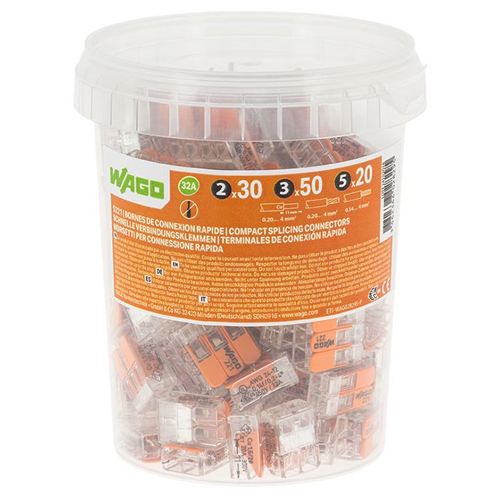 Le pot comprend : - 30 bornes 2 entrées - 50 bornes 3 entrées - 20 bornes 5 entrées Pour fils souples et rigides Sans outils Jusqu'à 32A Doté de 2 points de test Possibilité de contrôler visuellement la connexion grâce au boîtier transparent Tension de référence EN [V] : 405V Surtension transitoire de référence [kV] : 4kV Courant nominal [A] : 32A Type de connexion : CAGE CLAMP® Raccordement possible : 0.14 à 4 mm² Longueur de dénudage : 11 mm