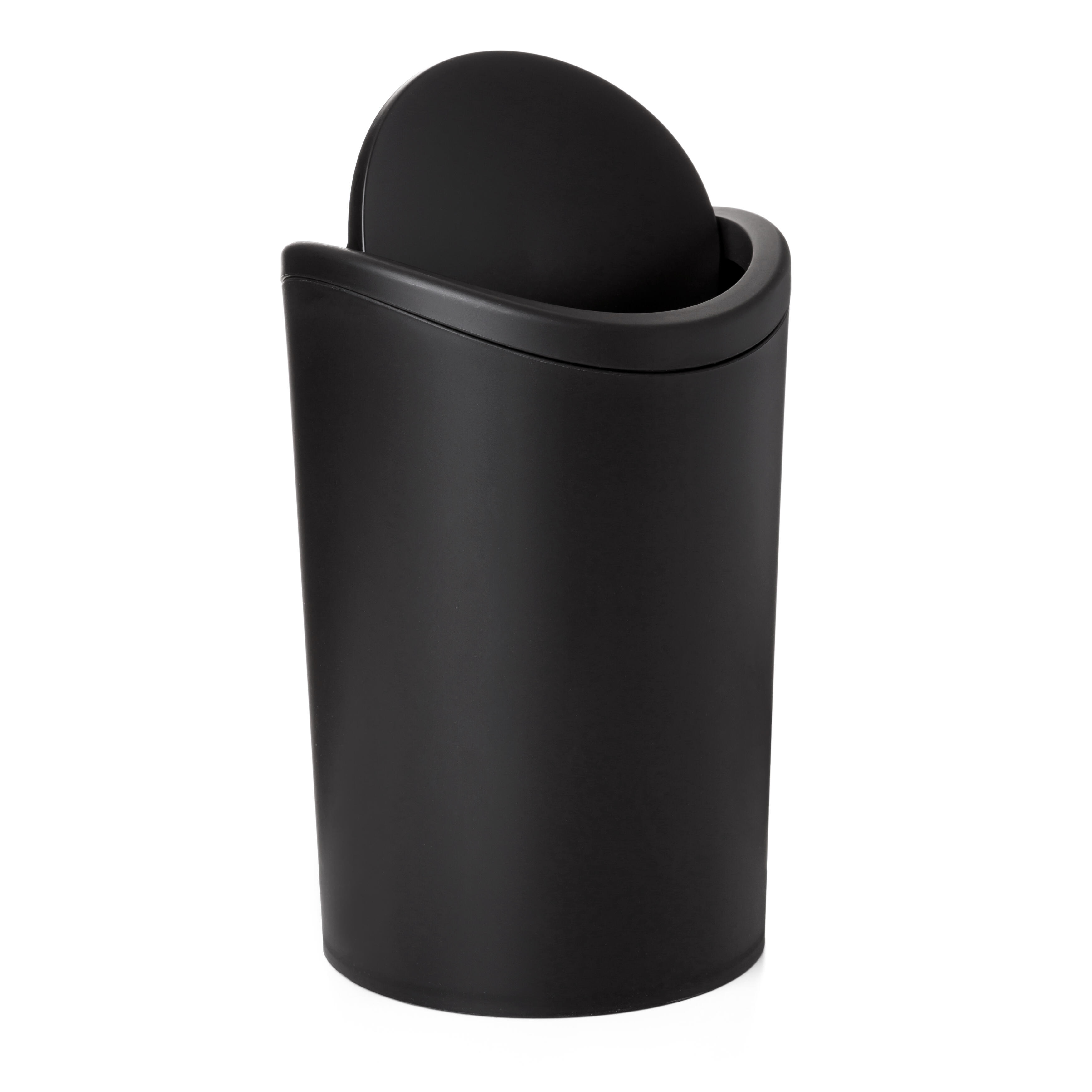 Poubelle de salle de bain ronde avec couvercle basculant en polypropylène noir finition mate, d'une capacité de 6 litres. Idéal à placer dans votre salle de bain ou vos toilettes, se combinant avec n'importe quel style de salle de bain grâce à la variété de couleurs que vous pouvez trouver chez Leroy Merlin. Dimensions : 17 x 26,4 x 23,5 cm (diamètre x hauteur x profondeur).